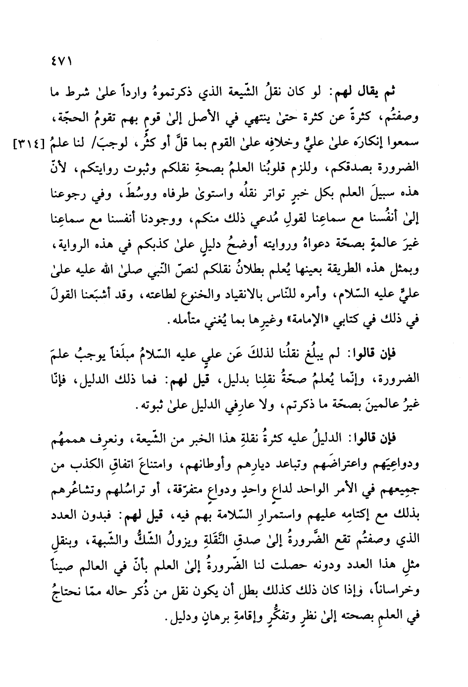 وبمثل هذه الطريقة بعينها يُعلم بطلانُ نقلكم لنص النبي - صلى الله عليه وسلم - على عليٍّ عليه السلام، وأمره للناس بالانقياد والخنوع لطاعته، وقد أشبَعنا القولَ في ذلك في كتابي "الإمامة" وغيرِها بما يُغني متأمله.