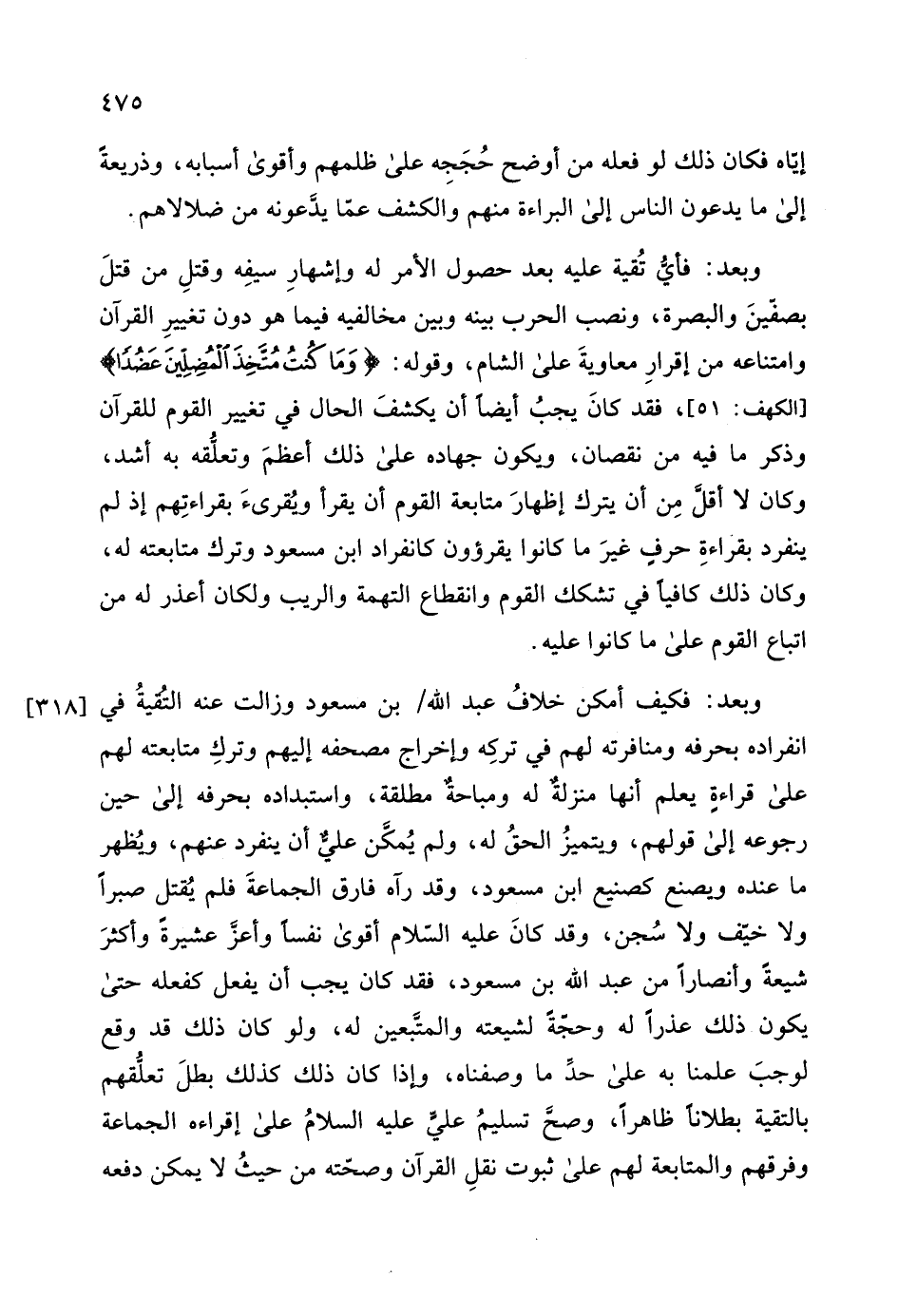 ينفرد بقراءةِ حرفٍ غيرَ ما كانوا يقرؤون كانفراد ابن مسعود وترك متابعته له، وكان ذلك كافيا في تشكك القوم وانقطاع التهمة والريب ولكان أعذر له من اتباع القوم على ما كانوا عليه.