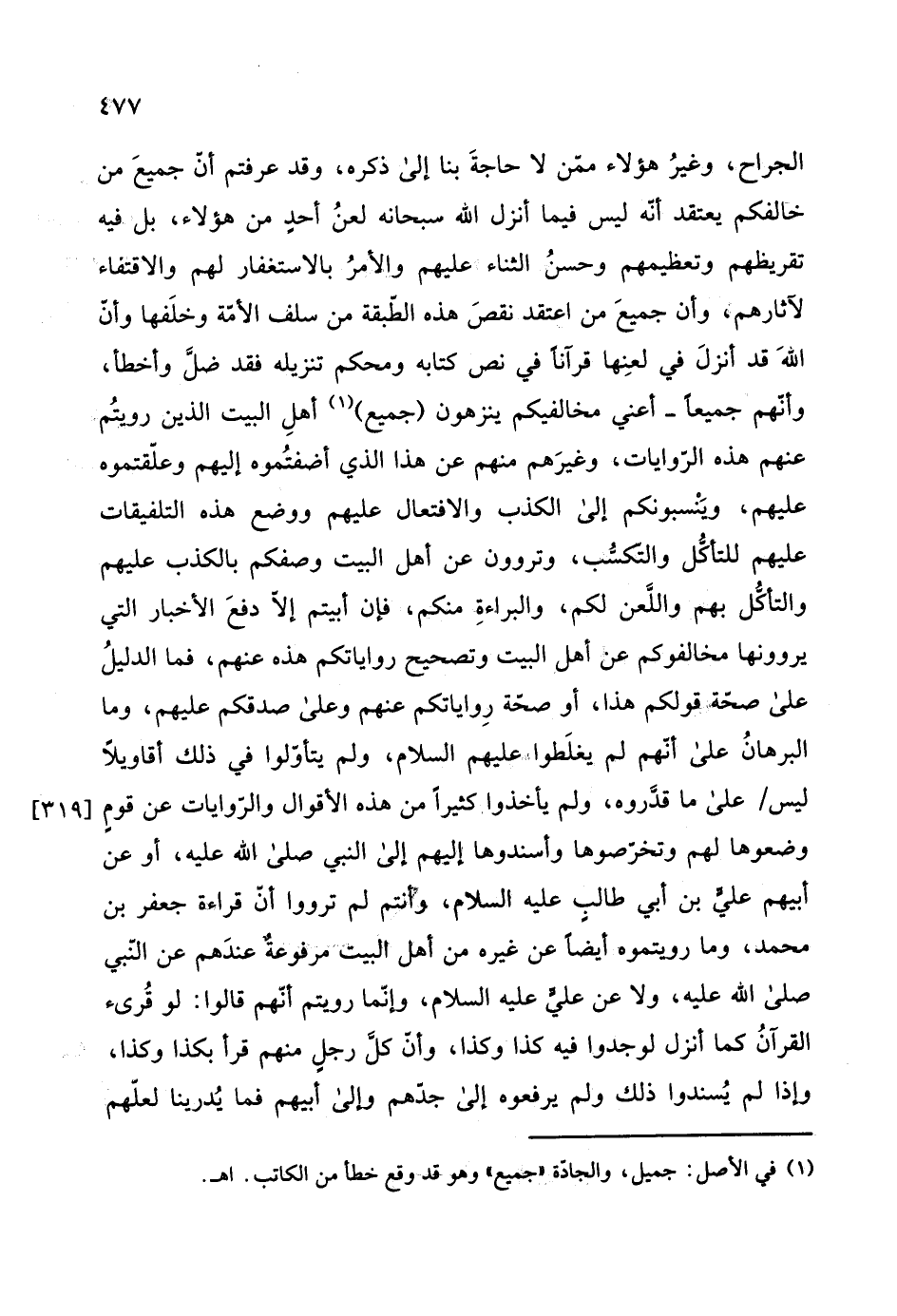 وأبو عبيدة بنُ الجراح، وغيرُ هؤلاء ممن لا حاجةَ بنا إلى ذكره، وقد عرفتم أن جميعَ من خالفكم يعتقد أنه ليس فيما أنزل الله سبحانه لعنُ أحدٍ من هؤلاء، بل فيه تقريظهم وتعظيمهم وحسنُ الثناء عليهم والأمرُ بالاستغفار لهم والاقتفاء لآثارهم، وأن جميعَ من اعتقد نقصَ هذه الطبقة من سلف الأمَّة وخلَفها وأن اللهَ قد أنزلَ في لعنِها قرآنا في نص كتابه ومحكم تنزيله فقد ضل وأخطأ، وأنهم جميعا - أعني مخالفيكم ينزهون جميع أهلِ البيت الذين رويتم