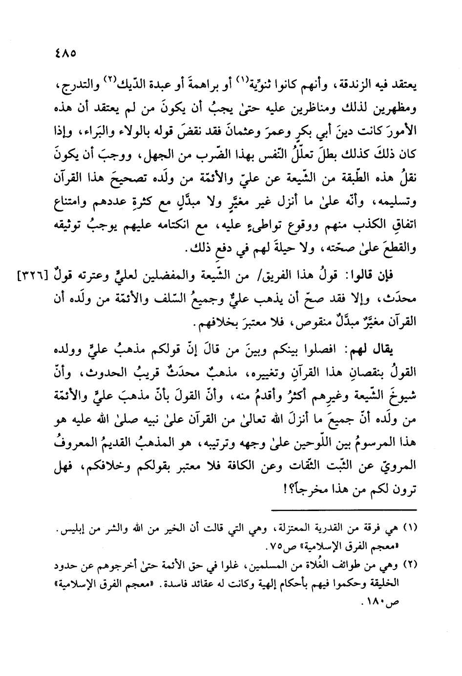 الأمورَ كانت دينَ أبي بكرٍ وعمرَ وعثمانَ فقد نقضَ قوله بالولاء والبراء، وإذا كان ذلكَ كذلك بطلَ تعللُ النفس بهذا الضرب من الجهل، ووجبَ أن يكونَ نقلُ هذه الطبقة من الشّيعة عن عليّ والأئمة من ولَده تصحيحَ هذا القرآن وتسليمه، وأنه على ما أنزل غير مغير ولا مبدل مع كثرةِ عددهم وامتناع اتفاقِ الكذب منهم ووقوع تواطىء عليه، مع انكتامه عليهم يوجبُ توثيقه والقطعَ على صحته، ولا حيلةَ لهم في دفعِ ذلك.