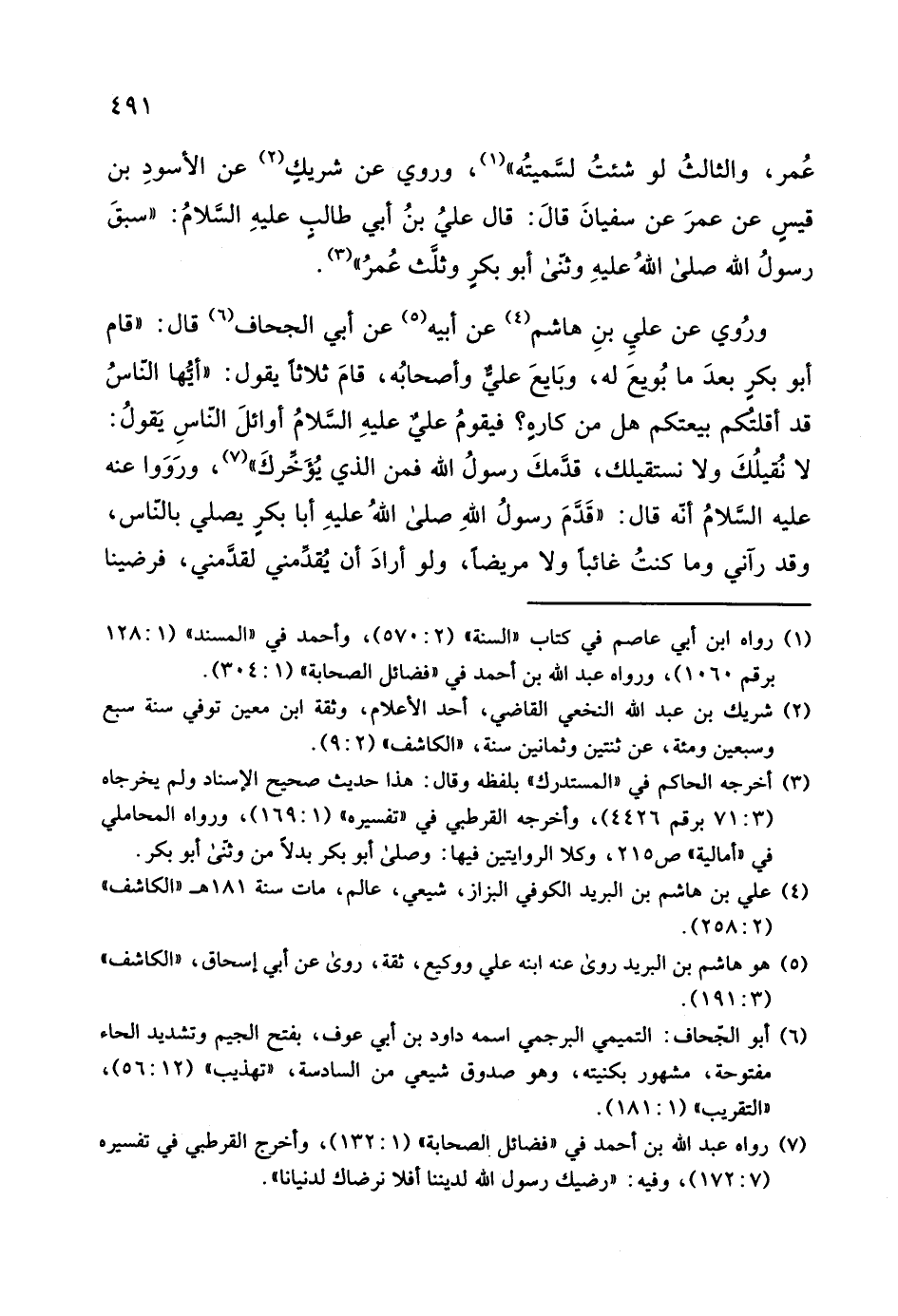 ورَوَوا عنه عليه السَّلامُ أنه قال: "قَدَّمَ رسولُ اللهِ صلى اللهُ عليهِ أبا بكرٍ يصلي بالناس، وقد رآني وما كنتُ غائبا ولا مريضا، ولو أرادَ أن يُقدِّمني لقدَّمني، فرضينا