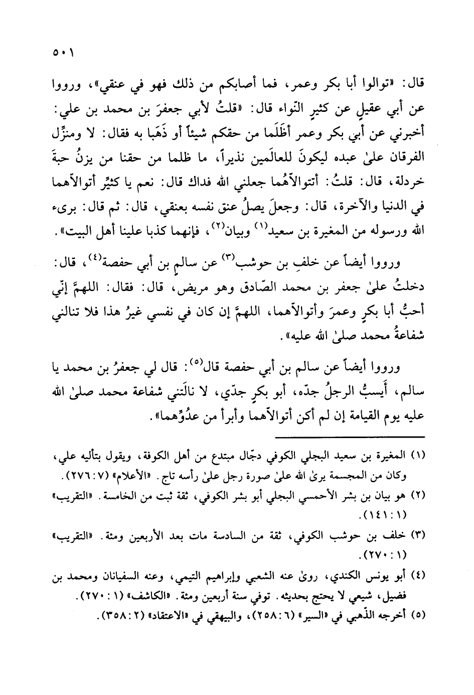 ورووا عن أبي عقيلٍ عن كثيرٍ النواء قال: "قلتُ لأبي جعفرَ بن محمد بن علي: أخبرني عن أبي بكر وعمر أظَلَما من حقكم شيئا أو ذَهَبا به فقال: لا ومنزَل
