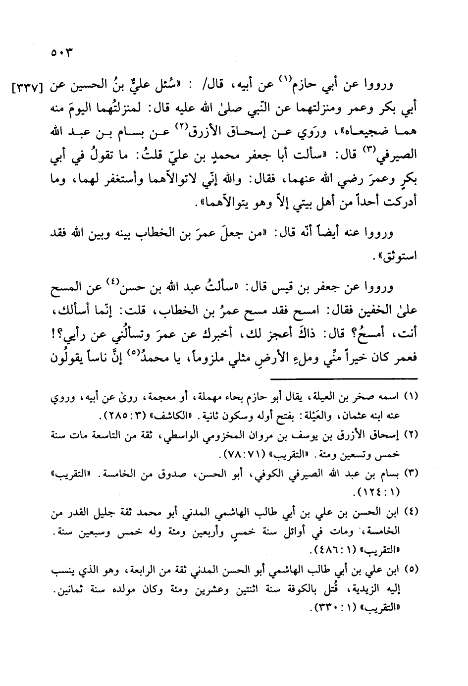 ورَوي عن إسحاق الأزرق عن بسام بن عبد الله الصيرفي قال: "سألت أبا جعفر محمدٍ بن علي قلتُ: ما تقولُ في أبي بكرِ وعمرَ رضي الله عنهما؟