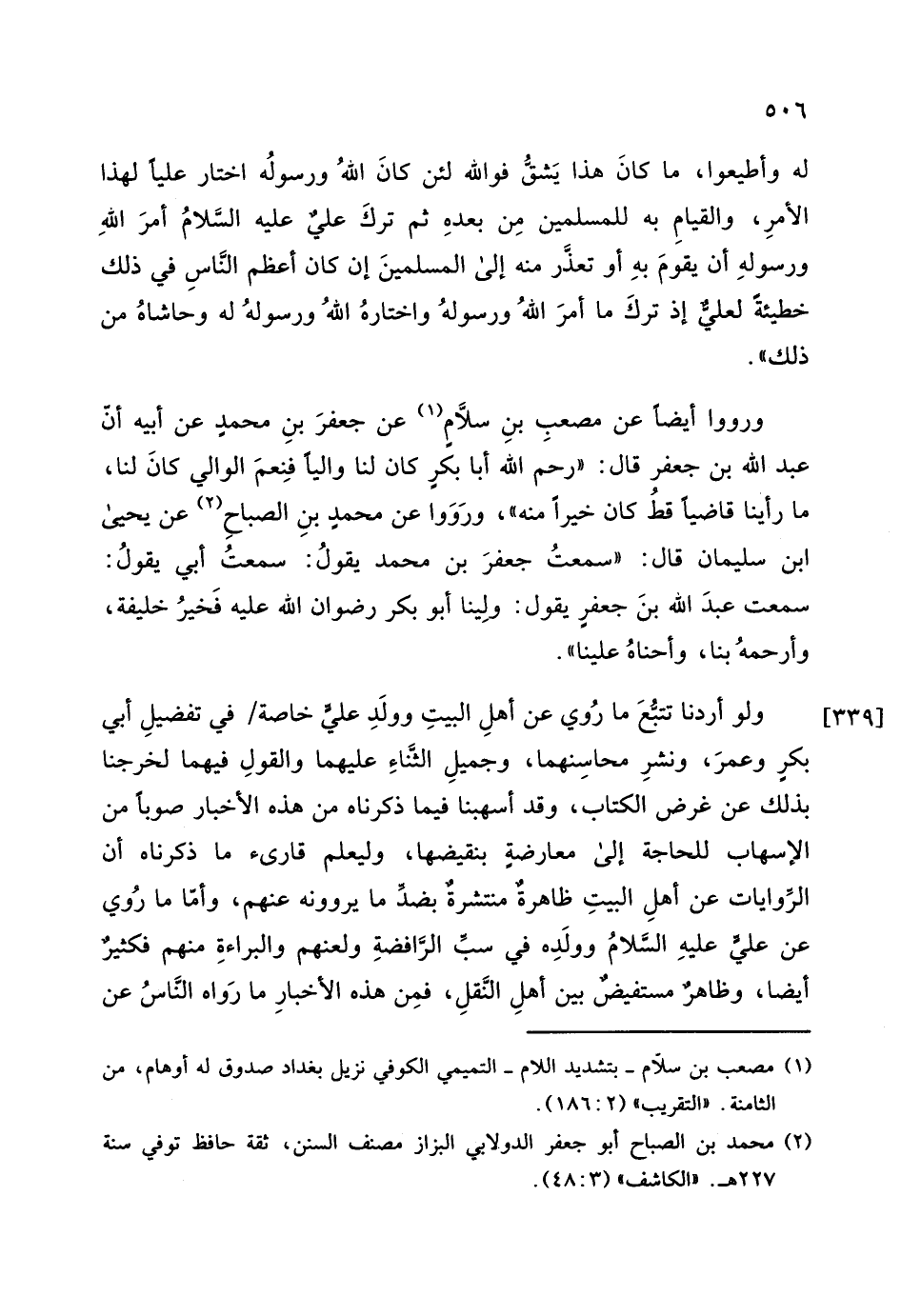 ورَوَوا عن محمدٍ بنِ الصباحِ عن يحيى ابن سليمان قال: "سمعتُ جعفرَ بن محمد يقولُ: سمعتُ أبي يقولُ: سمعت عبدَ الله بنَ جعفرٍ يقول: ولِينا أبو بكر رضوان الله عليه فَخيرُ خليفة، وأرحمهُ بنا، وأحناهُ علينا".