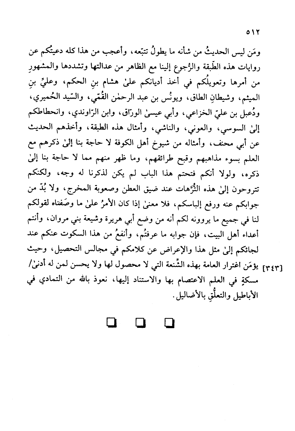 ومَن ليس الحديثُ من شأنه ما يطولُ تتبعه، وأعجب من هذا كله دعيتكم عن روايات هذه الطبقة والرجوع إلينا مع الظاهر من عدالتها وتشددها والمشهورِ من أمرها وتعويلُكم في أخذ أديانكم على هشام بنِ الحكم، وعلي بنِ الميثم، وشيطانِ الطاق، ويونُس بن عبد الرحمن القُمِّي، والسيد الحُميري، ودُعبل بن على الخزاعي، وأبي عيسى الوراق، وابن الراوندي، وانحطاطكم إلى السوسي، والعوني، والناشي، وأمثال هذه الطبقة، وأخذهم الحديث عن أبي محنف، وأمثاله من شيوخ أهل الكوفة لا حاجة بنا، إلى ذكرهم مع العلم بسوء مذاهبهم وقبح طرائقهم، وما ظهر منهم مما لا حاجة بنا إلى ذكره، ولولا أنكم فتحتم هذا الباب لم يكن لذكرنا له وجه، ولكنكم