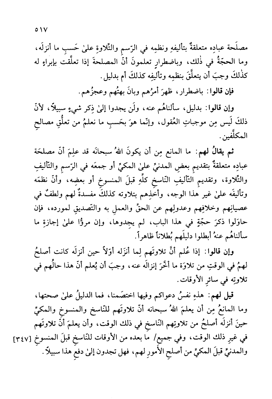 مصلَحة عبادِه متعلقة بتأليفهِ ونظمِه في الرّسمِ والتلاوةِ على حَسبِ ما أنزلَه، وما الحجَّة ُ في ذلك، وباضطرارٍ تعلمونَ أن المصلحةَ إذا تعلَّقت بإبراءٍ له