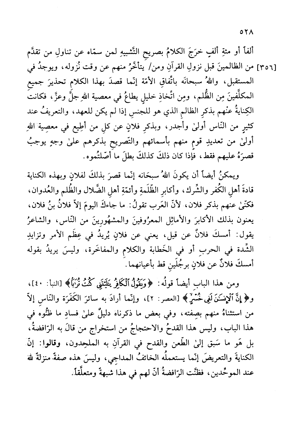 وإنّما أرادَ به سائرَ الكَفَرَة والنّاسِ إلاّ من استثناهُ منهم بصِفته، وفي بعض ما ذكرناه دليلٌ على فسادِ ما ظنُّه في هذا الباب، وليس هذا القدحُ والاحتجاجُ من استخراج من قالَ به الرّافضةُ، بل هَو ما سَبق إلى الطّعن والقدح في القرآنِ به الملحِدون، وقالوا: إن الكنايةَ والتعريضَ إنّما يستعملُه الخائفُ المداجِي، وليسَ هذه صفةً منزلةً لله عند الموحدين، فظنَّت الرّافضةُ أن لهم في هذا شبهةً ومتعلَّقا.