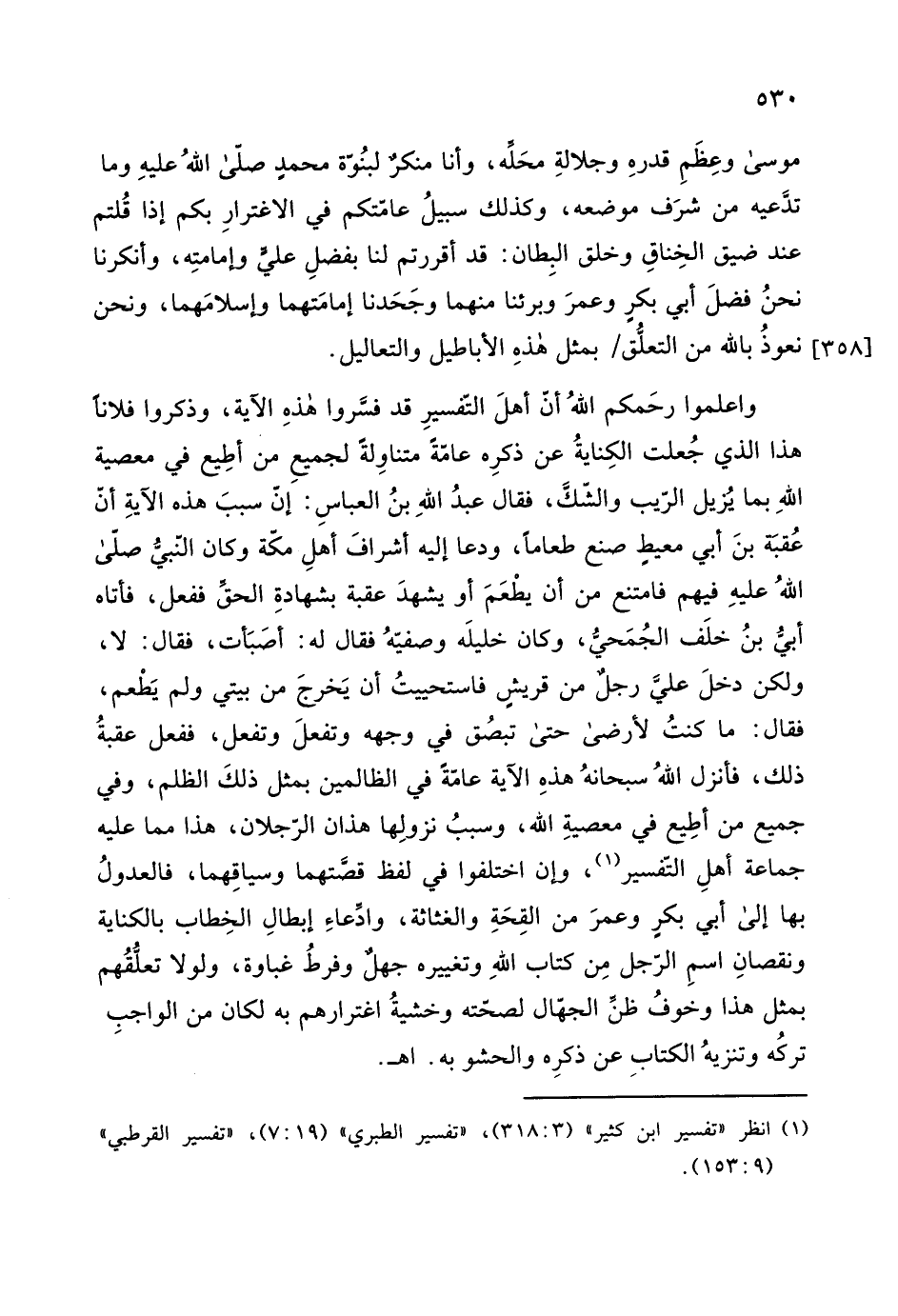 بها إلى أبي بكرٍ وعمرَ من القِحَةِ والغثاثة، وادعاءِ إبطالِ الخِطاب بالكناية