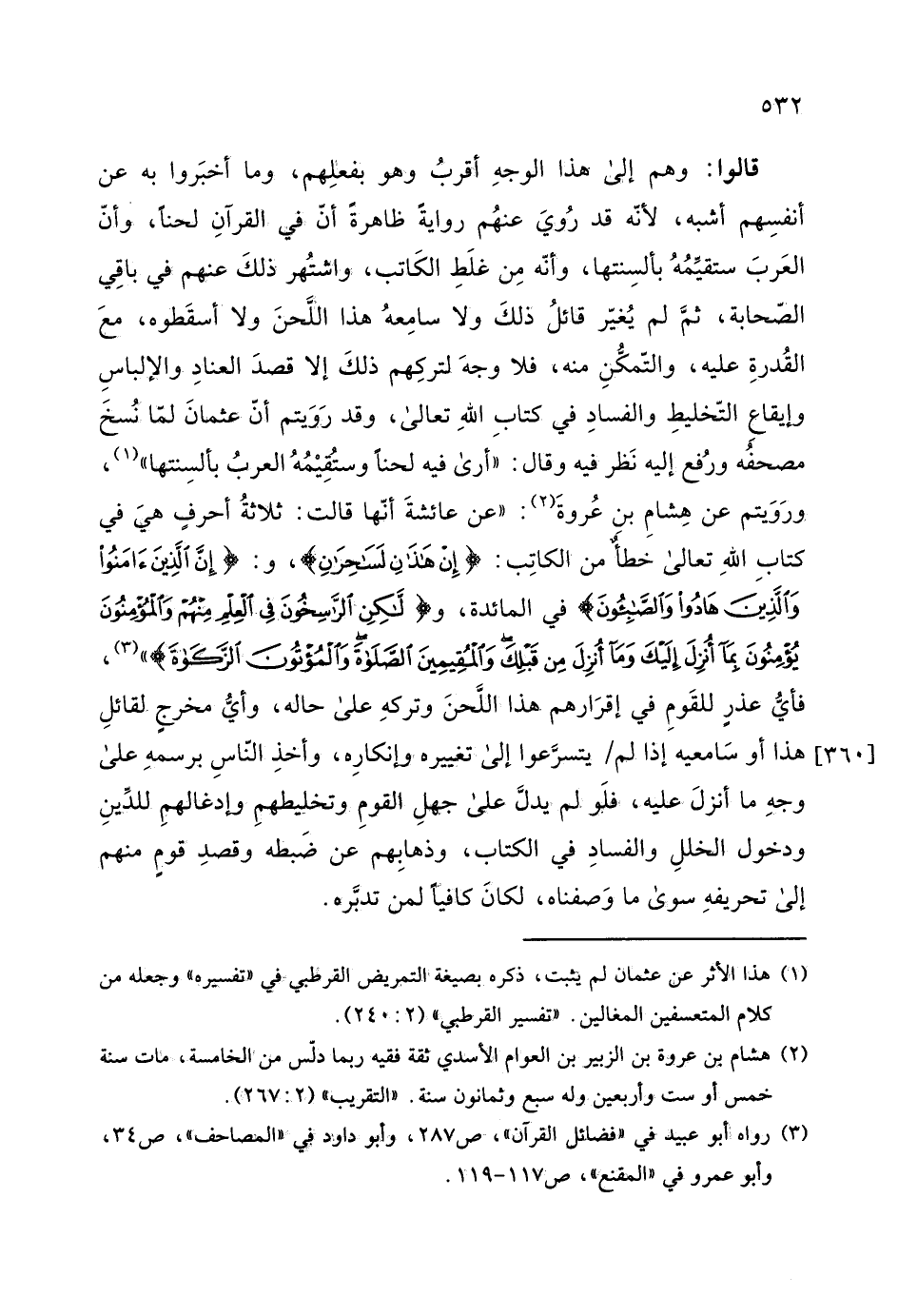 مصحفُه ورُفع إليه نَظر فيه وقال: "أرى فيه لحناً وستُقِيْمُهُ العربُ بألسِنتها" (1) ، ورَوَيتم عن هِشامِ بنِ عُروةَ: "عن عائشةَ أنّها قالت: ثلاثةُ أحرفٍ هيَ في كتابِ اللهِ تعالى خطأٌ من الكاتِب: (إِنْ هَذَانِ لَسَاحِرَانِ) ، و: (إِنَّ الَّذِينَ آمَنُوا وَالَّذِينَ هَادُوا وَالصَّابِئُونَ) في المائدة، و ((لَكِنِ الرَّاسِخُونَ فِي الْعِلْمِ مِنْهُمْ وَالْمُؤْمِنُونَ يُؤْمِنُونَ بِمَا أُنْزِلَ إِلَيْكَ وَمَا أُنْزِلَ مِنْ قَبْلِكَ وَالْمُقِيمِينَ الصَّلَاةَ وَالْمُؤْتُونَ الزَّكَاةَ) .