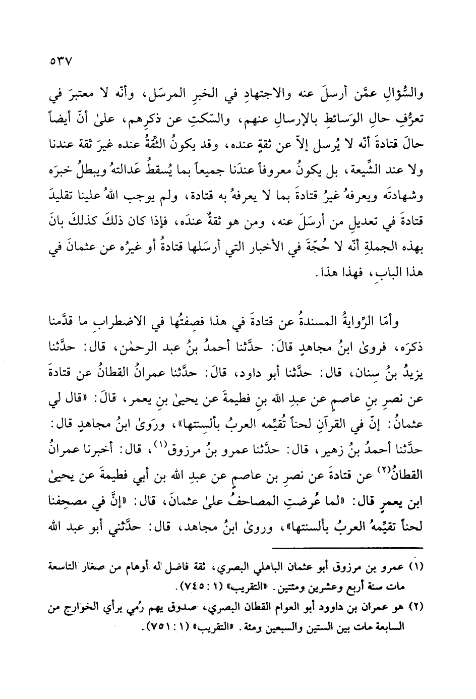 يزيدُ بنُ سِنان، قال: حدَّثنا أبو داود، قالَ: حدَّثنا عمرانُ القطانُ عن قتادةَ عن نصرِ بنِ عاصمٍ عن عبدِ الله بنِ فطيمةَ عن يحيى بنِ يعمر، "قالَ: "قال لي عثمانُ: إن في القرآنِ لحنا تُقيِّمه العربُ بألسِتتها".