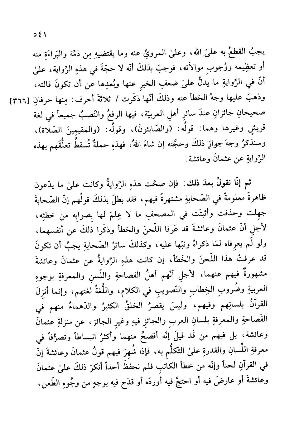 ظاهرةً معلومةً في الصَّحابةِ مشتهرةً فيهم، فقد بطلَ بذلكَ قولُهم إنَّ الصَّحابة َجهِلت وحذفت وأثبتَت في المصحفِ ما لا عِلمَ لها بِصوابِه من خطئِه، لأجلِ أنّ عثمانَ وعائشةَ قد عَرفا اللّحنَ والخطأ وذكَرا ذلكَ عن أنفسهما.