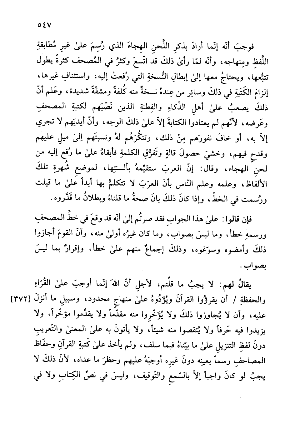 دونَ لفظِ التنزيلِ على ما بيّناهُ فيما سلف، ولم يأخذ على كَتبةِ القرآنِ وحفاظ المصاحفِ رسما بعينِه دونَ غيرِه أوجبَهُ عليهم وحظرَ ما عداه، لأن ذلكَ لا يجبُ لو كانَ واجبا إلا بالسمعِ والتوقيف، وليسَ في نص الكِتابِ ولا في