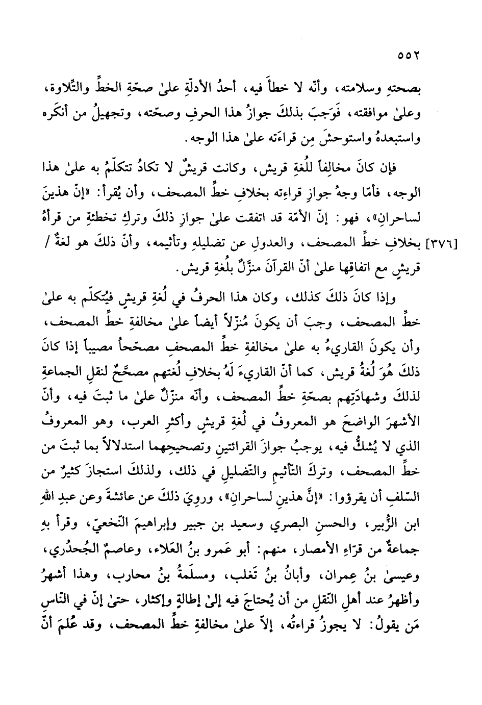 لساحرانِ "، فهو: إن الأمَّة قد اتفقت على جوازِ ذلكَ وتركِ تخطئةِ من قرأهُ