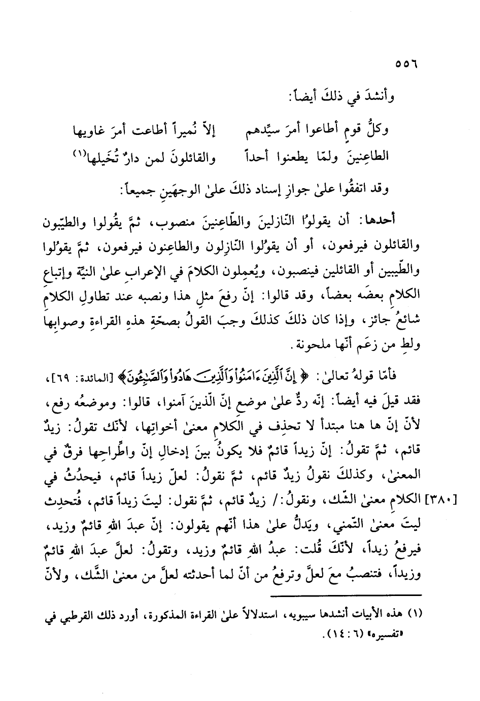فقد قيلَ فيه أيضًا: إنّه رد على موضعِ إنَّ الذينَ آمنوا، قالوا: وموضعُه رفع، لأنّ إنَّ ها هنا مبتدأ لا تحذِف في الكلامِ معنى أخواتِها، لأنك تقولُ: زيد