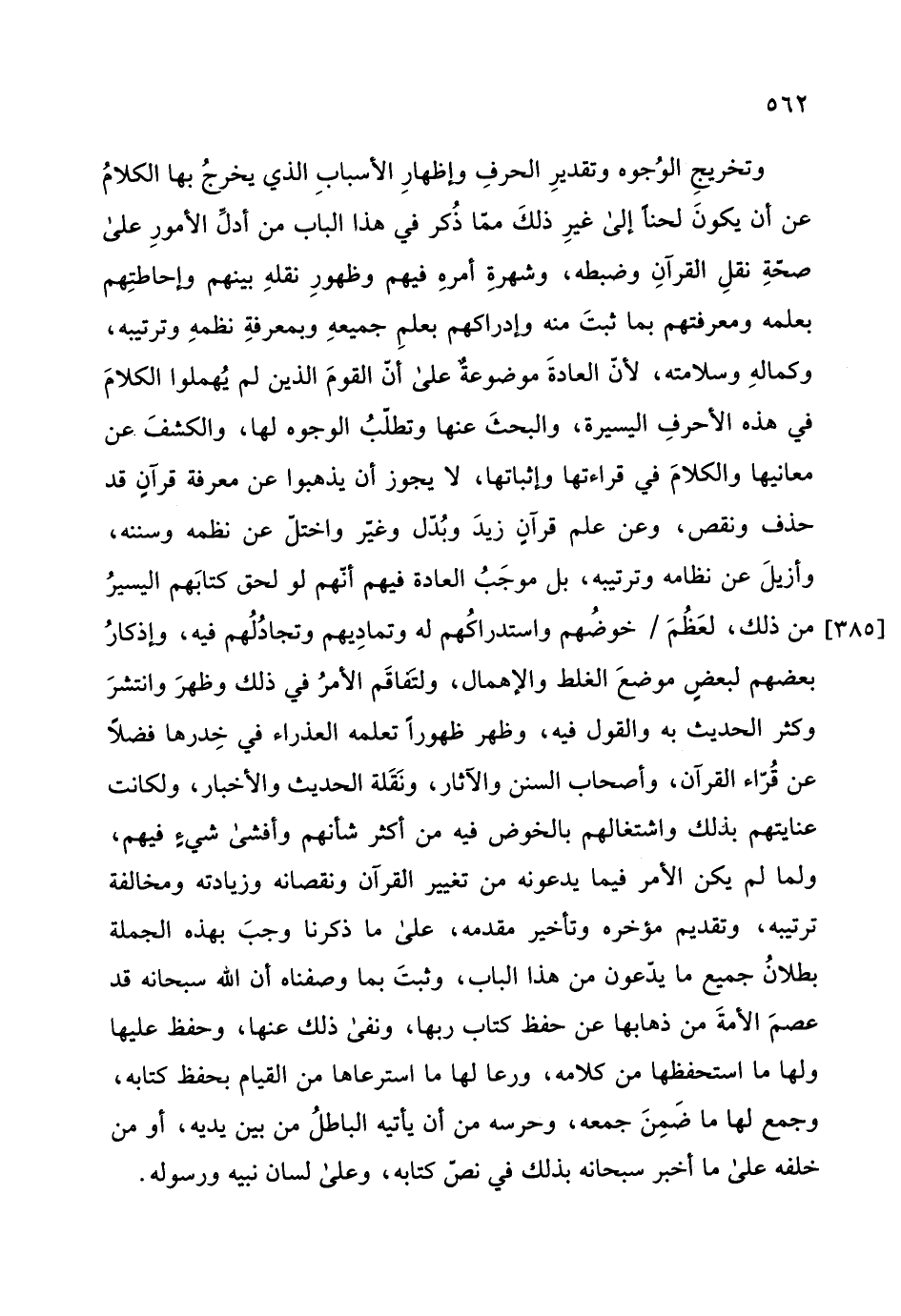 عن قُراء القرآن، وأصحاب السنن والآثار، ونَقَلة الحديث والأخبار، ولكانت عنايتهم بذلك واشتغالهم بالخوض فيه من أكثر شأنهم وأفشى شيءٍ فيهم، ولما لم يكن الأمر فيما يدعونه من تغيير القرآن ونقصانه وزيادته ومخالفة ترتيبه، وتقديم مؤخره وتأخير مقدمه، على ما ذكرنا وجبَ بهذه الجملة بطلانُ جميع ما يدعون من هذا الباب، وثبتَ بما وصفناه أن الله سبحانه قد عصمَ الأمةَ من ذهابها عن حفظ كتاب ربها، ونفى ذلك عنها، وحفظ عليها ولها ما استحفظها من كلامه، ورعا لها ما استرعاها من القيام بحفظ كتابه، وجمع لها ما ضَمِنَ جمعه، وحرسه من أن يأتيه الباطلُ من بين يديه، أو من خلفه على ما أخبر سبحانه بذلك في نص كتابه، وعلى لسان نبيه ورسوله.