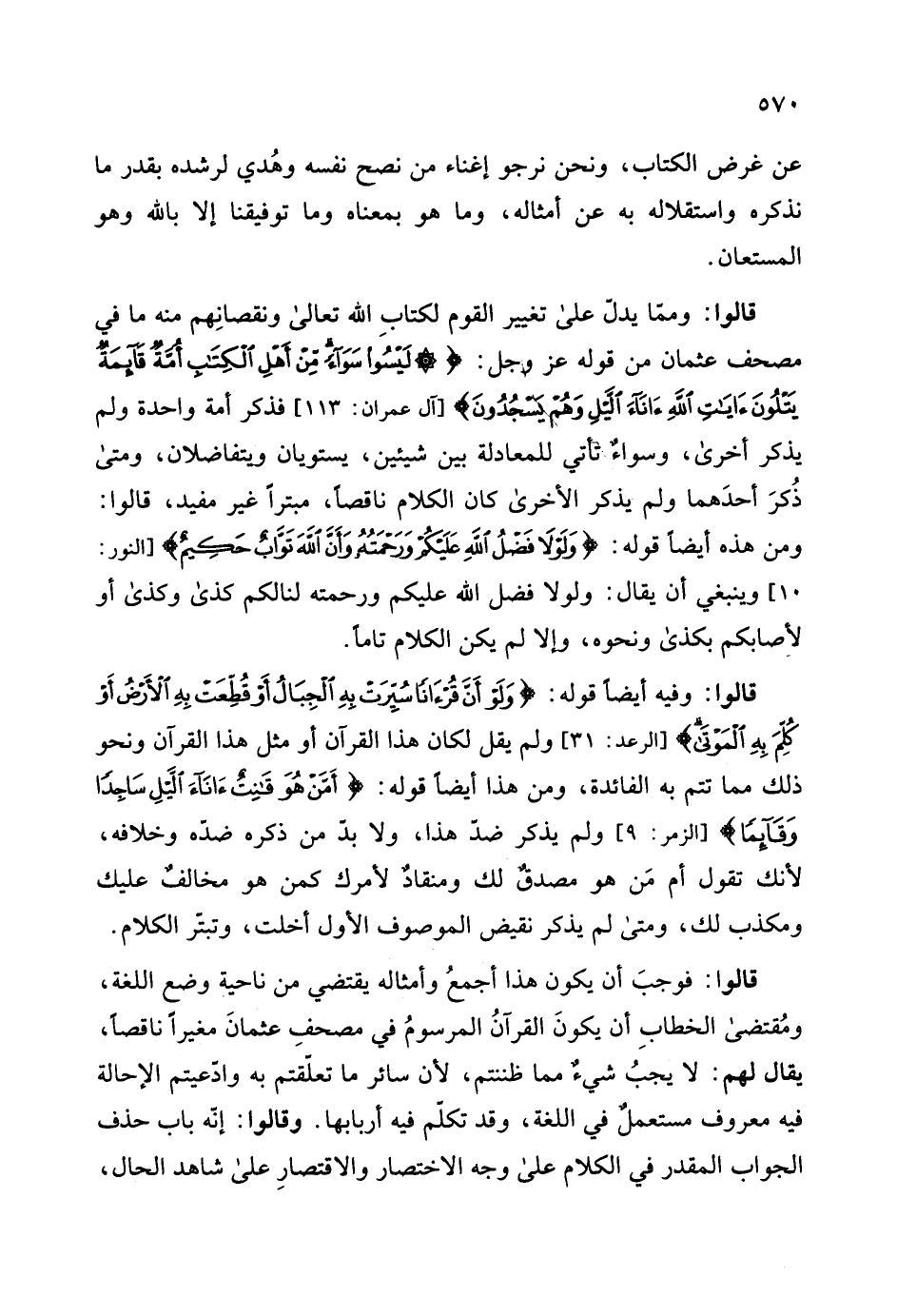 ومُقتضى الخطابِ أن يكونَ القرآنُ المرسومُ في مصحفِ عثمانَ مغيراً ناقصا.