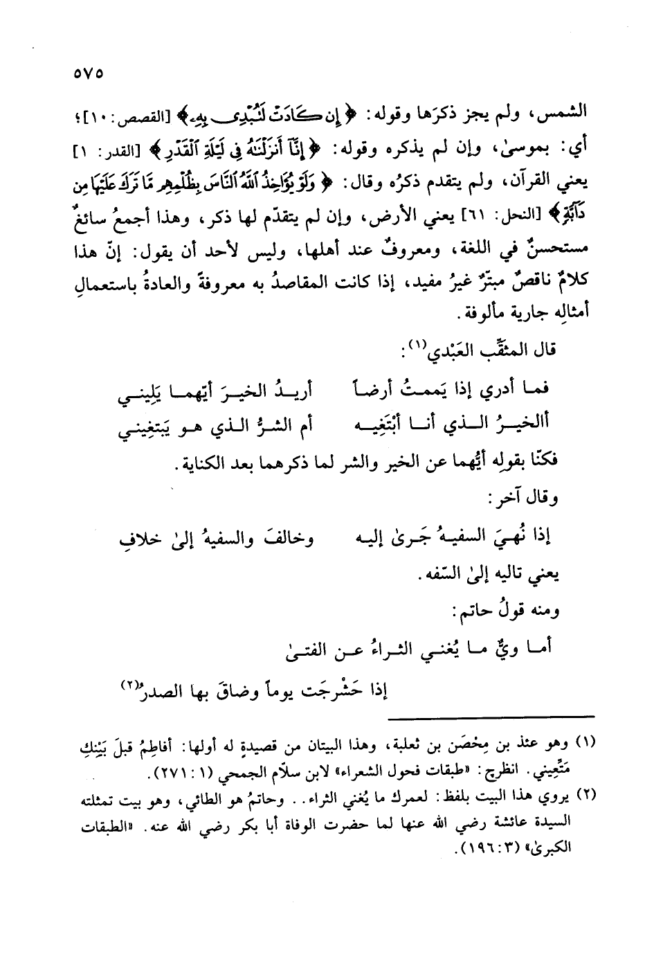 الشمس، ولم يجر ذكرَها وقوله: (إِنْ كَادَتْ لَتُبْدِي بِهِ) ، أي: بموسى، وإن لم يذكره وقوله: (إِنَّا أَنْزَلْنَاهُ فِي لَيْلَةِ الْقَدْرِ) ، يعني القرآن، ولم يتقدم ذكرُه وقال: (وَلَوْ يُؤَاخِذُ اللَّهُ النَّاسَ بِظُلْمِهِمْ مَا تَرَكَ عَلَيْهَا مِنْ دَابَّةٍ) ، يعني الأرض، وإن لم يتقدم لها ذكر، وهذا أجمعُ سائغ مستحسن في اللغة، ومعروف عند أهلها، وليس لأحد أن يقول: إن هذا كلام ناقص مبتّرٌ غيرُ مفيد، إذا كانت المقاصدُ به معروفةً والعادةُ باستعمالِ أمثالِه جارية مألوفة.