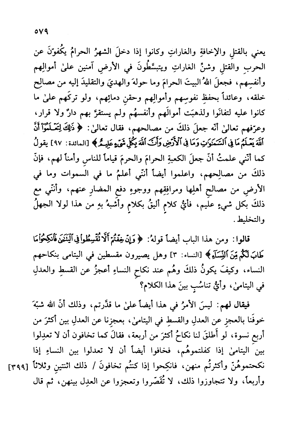 قالوا: ومن هذا الباب أيضا قولهُ: (وَإِنْ خِفْتُمْ أَلَّا تُقْسِطُوا فِي الْيَتَامَى فَانْكِحُوا مَا طَابَ لَكُمْ مِنَ النِّسَاءِ) ، وهل يصيرون مقسطين في اليتامى بنكاحهم النساء، وكيفَ يكونُ ذلكَ وهُم عند نكاحِ النساءِ أعجزُ عن القسطِ والعدلِ في اليتامى، وأيُّ تناسُبٍ بينَ هذا الكلام؟