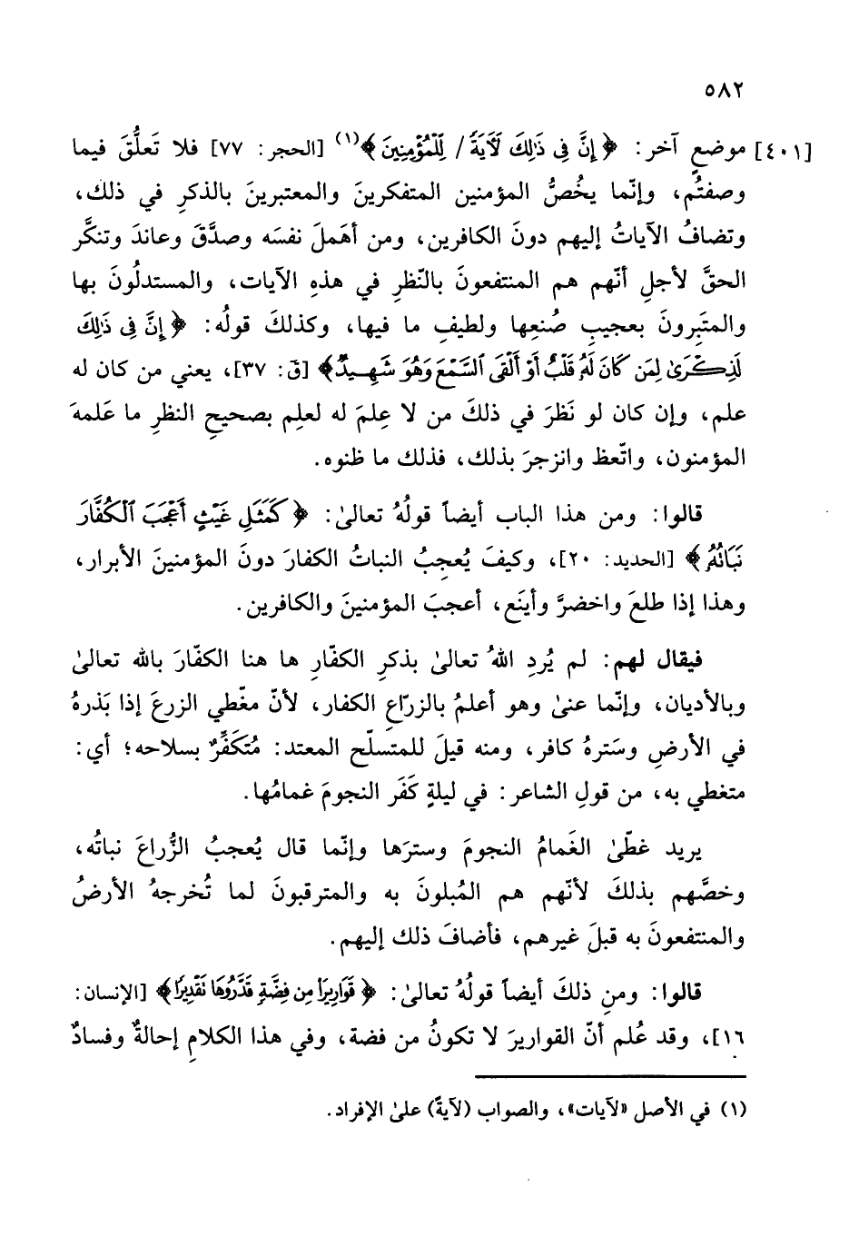 قالوا: ومن هذا الباب أيضا قولُهُ تعالى: (كَمَثَلِ غَيْثٍ أَعْجَبَ الْكُفَّارَ نَبَاتُهُ) ، وكيفَ يُعجِبُ النباتُ الكفارَ دونَ المؤمنينَ الأبرار.