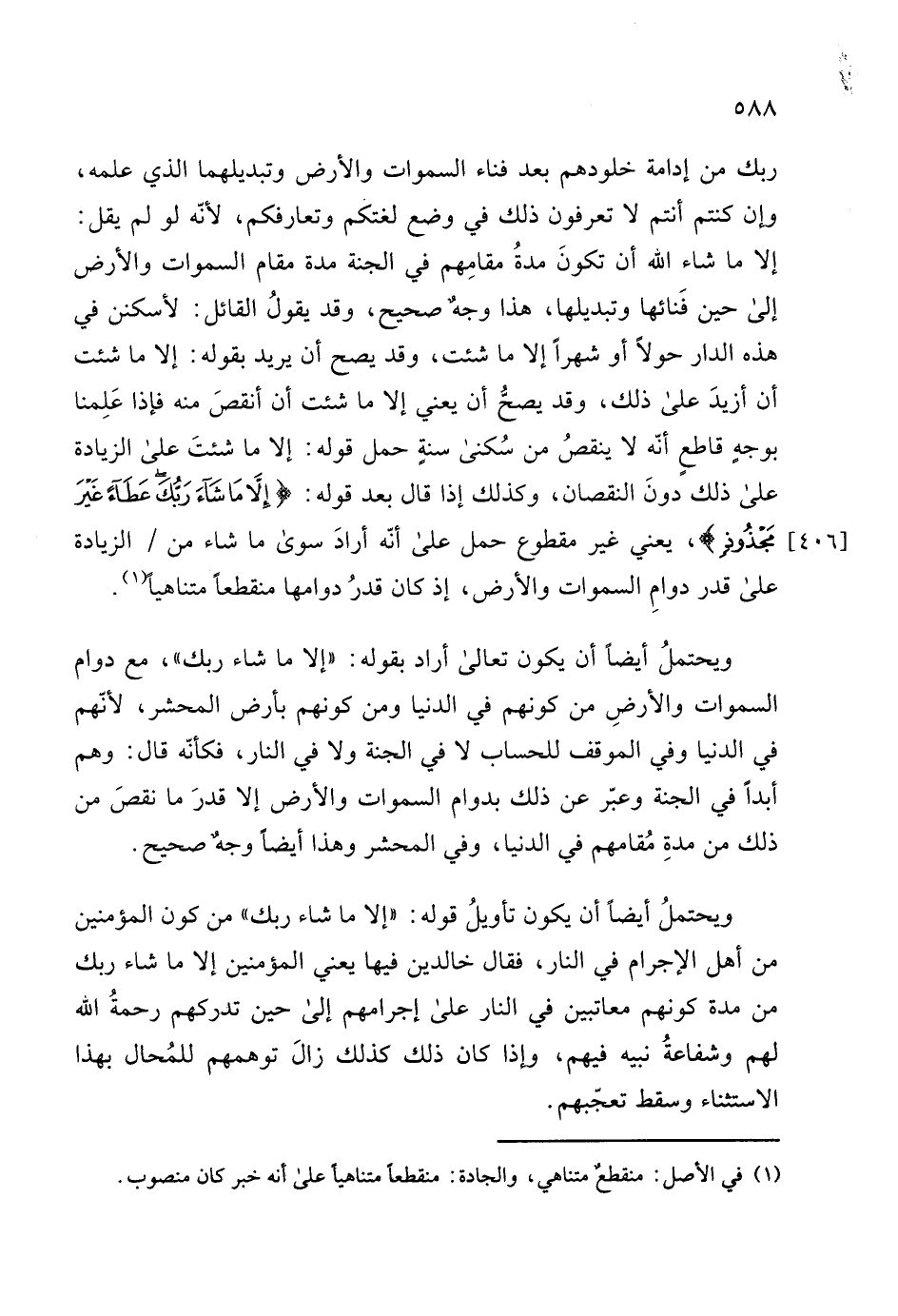 هذه الدار حولاَ أو شهراَ إلا ما شئت، وقد يصح أن يريد بقوله: إلا ما شئت أن أزيدَ على ذلك، وقد يصحُّ أن يعني إلا ما شئت أن أنقصَ منه فإذا عَلِمنا بوجهٍ قاطعٍ أنّه لا ينقصُ من سُكنى سنةِ حمل قوله: إلا ما شئتَ على الزيادة على ذلك دونَ النقصان، وكذلك إذا قال بعد قوله: (إِلَّا مَا شَاءَ رَبُّكَ عَطَاءً غَيْرَ مَجْذُوذٍ) ، يعني غير مقطوع حمل على أنّه أرادَ سوى ما شاء من الزيادة على قدر دوامِ السموات والأرض، إذ كان قدرُ دوامها منقطعاَ متناهيا.