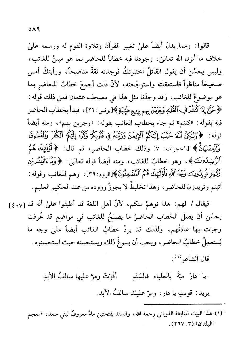 قوله: (وَلَكِنَّ اللَّهَ حَبَّبَ إِلَيْكُمُ الْإِيمَانَ وَزَيَّنَهُ فِي قُلُوبِكُمْ وَكَرَّهَ إِلَيْكُمُ الْكُفْرَ وَالْفُسُوقَ وَالْعِصْيَانَ) ، وذلك خطاب الحاضر، ثم قال: (أُولَئِكَ هُمُ الرَّاشِدُونَ) ، وهو خطالب للغانب، ومنه أيضاً قوله تعالى: (وَمَا آتَيْتُمْ مِنْ زَكَاةٍ تُرِيدُونَ وَجْهَ اللَّهِ فَأُولَئِكَ هُمُ الْمُضْعِفُونَ (39) .