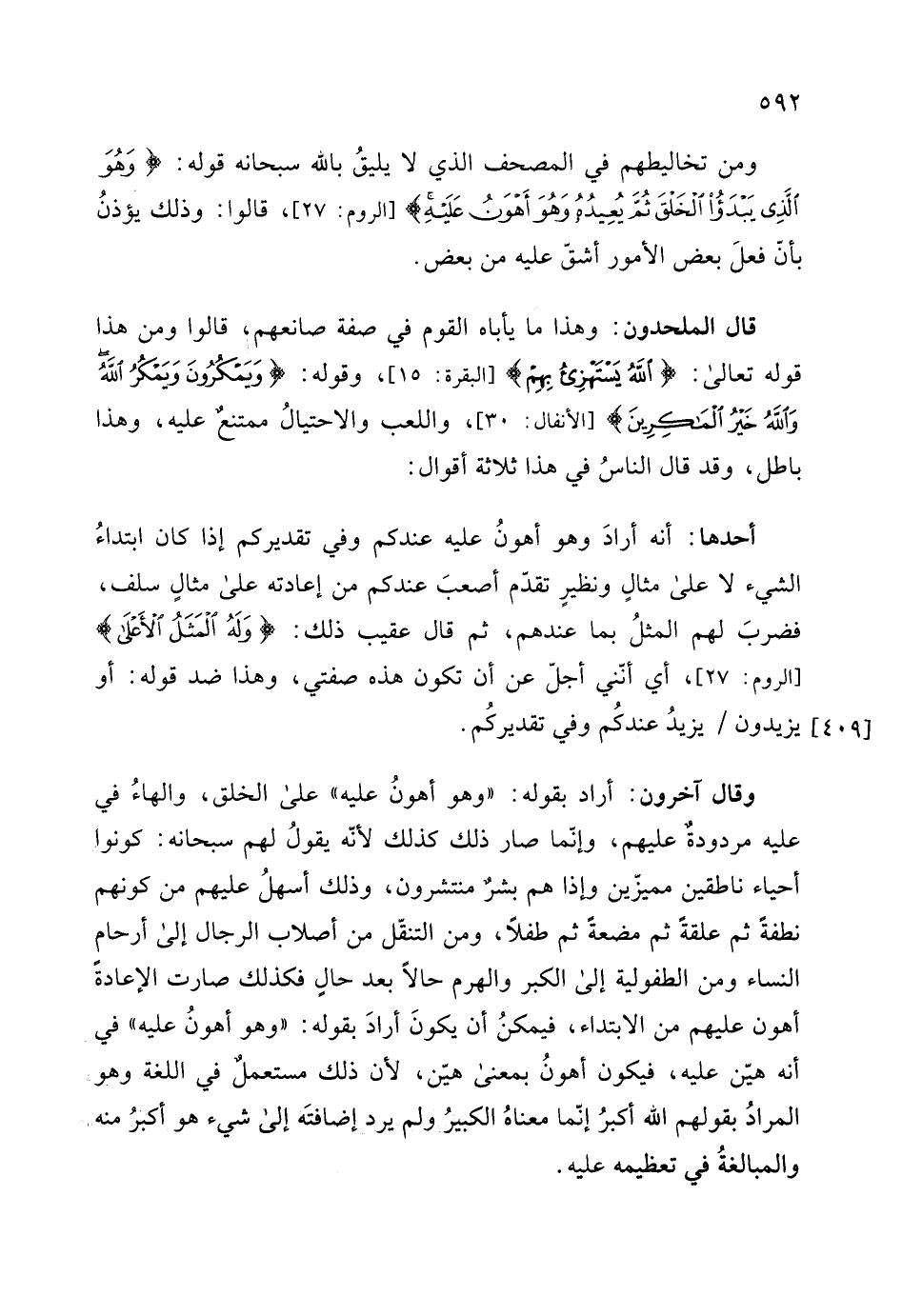 ومن تخاليطهم في المصحف الذي لا يليقُ بالله سبحانه قوله: (وَهُوَ الَّذِي يَبْدَأُ الْخَلْقَ ثُمَّ يُعِيدُهُ وَهُوَ أَهْوَنُ عَلَيْهِ) .