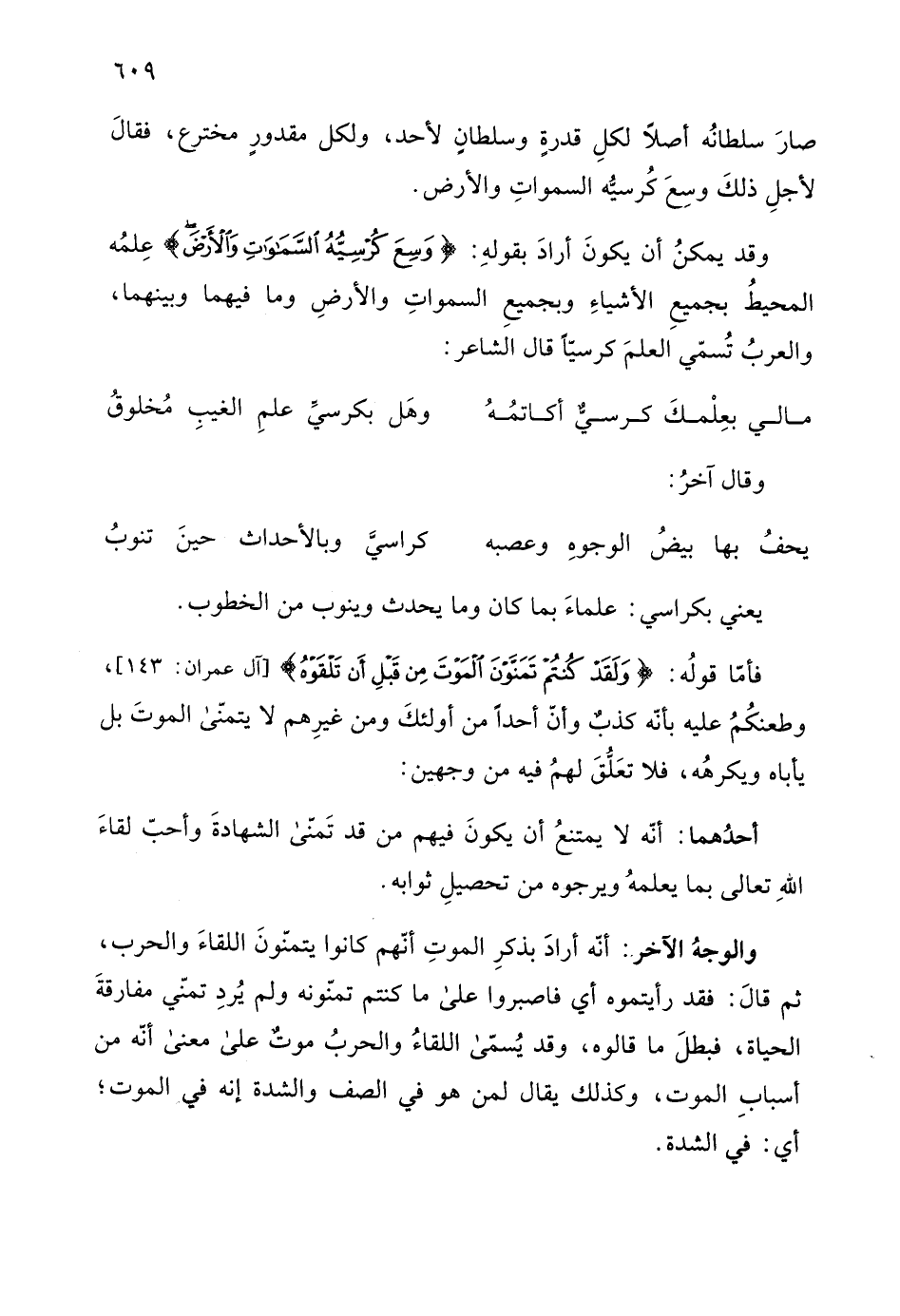 وقد يمكنُ أن يكونَ أرادَ بقولهِ: (وَسِعَ كُرْسِيُّهُ السَّمَاوَاتِ وَالْأَرْضَ) عِلمُه