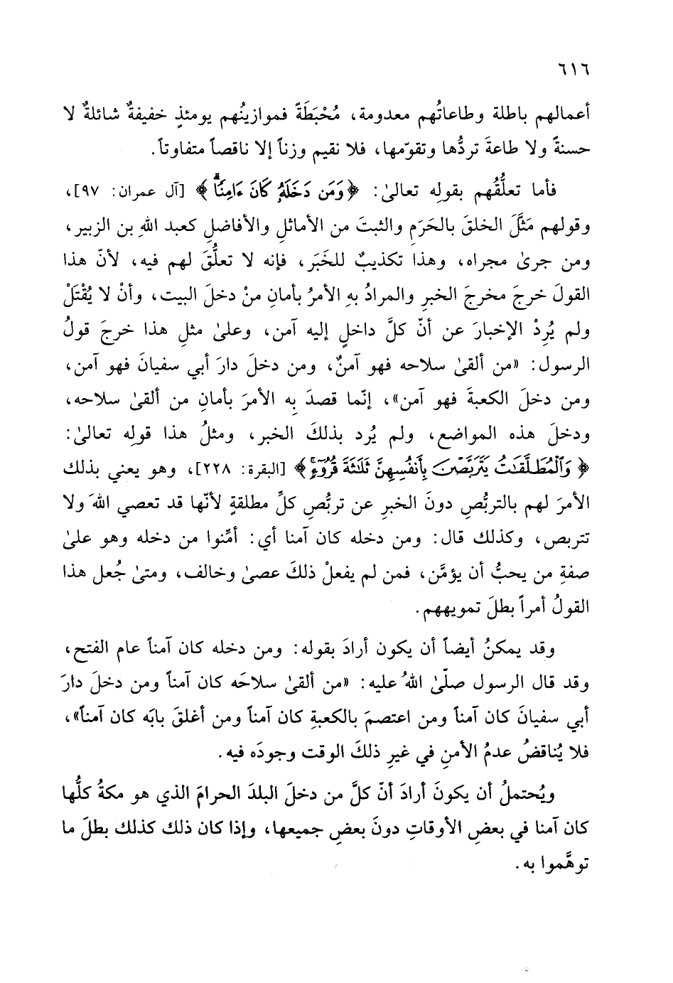 ومن دخلَ الكعبةَ فهو آمن "، إنَّما قصدَ بِه الأمرَ بأمانِ من ألقى سلاحه.