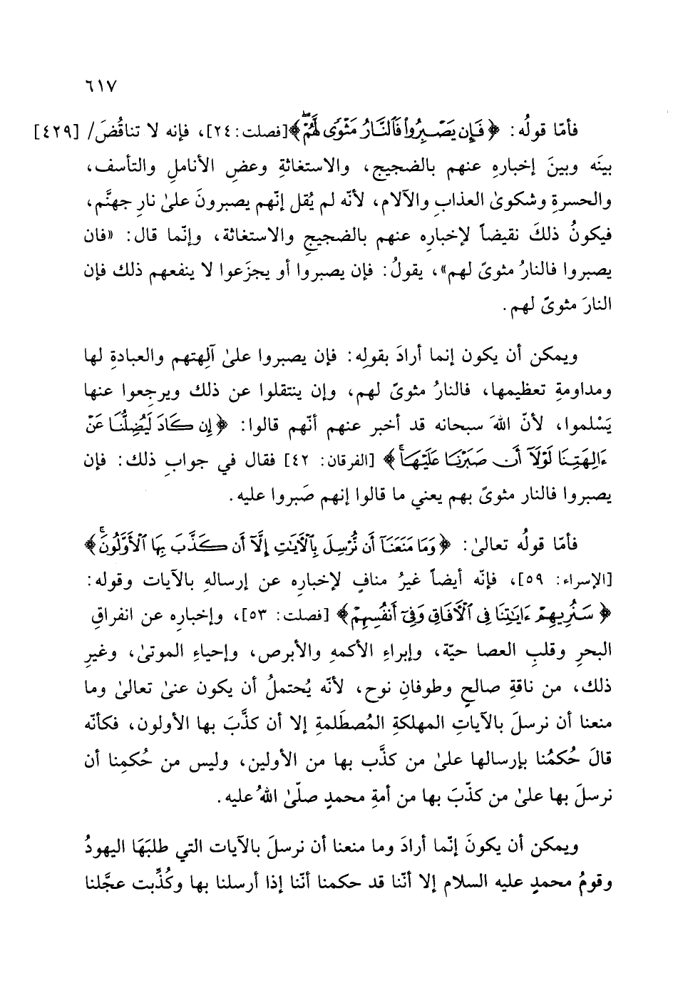 فأمَّا قولُه: (فَإِنْ يَصْبِرُوا فَالنَّارُ مَثْوًى لَهُمْ) ، إنه لا تناقضَ بينَه وبينَ إخبارهِ عنهم بالضجيج، والاستغاثةِ وعضِ الأناملِ والتأسف، والحسرةِ وشكوى العذابِ والآلام، لأنّه لم يُقل إنهم يصبرونَ على نارِ جهنَّم، فيكونُ ذلكَ نقيضاً لإخبارِه عنهم بالضجيجِ والاستغاثة، وإنما قال: (فَإِنْ يَصْبِرُوا فَالنَّارُ مَثْوًى لَهُمْ) ، يقولُ: فإن يصبروا أو يجزَعوا لا ينفعهم ذلك فإن