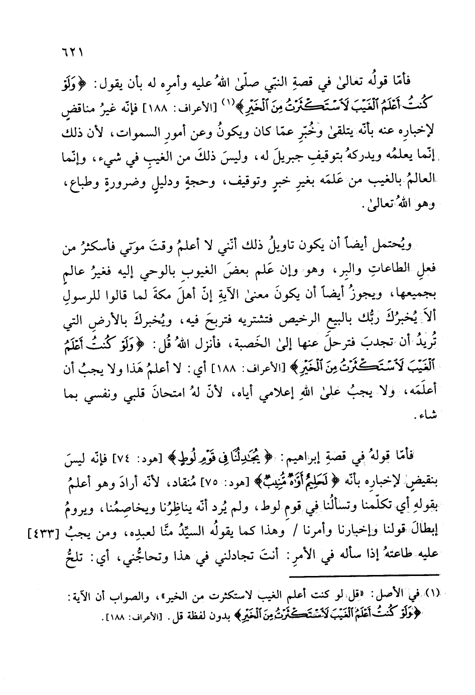 فأمّا قولُه تعالى في قصةِ النتي صلّى اللهُ عليه وأمرِه له بأن يقول: (وَلَوْ كُنْتُ أَعْلَمُ الْغَيْبَ لَاسْتَكْثَرْتُ مِنَ الْخَيْرِ) ، فإنّه غيرُ مناقضِ