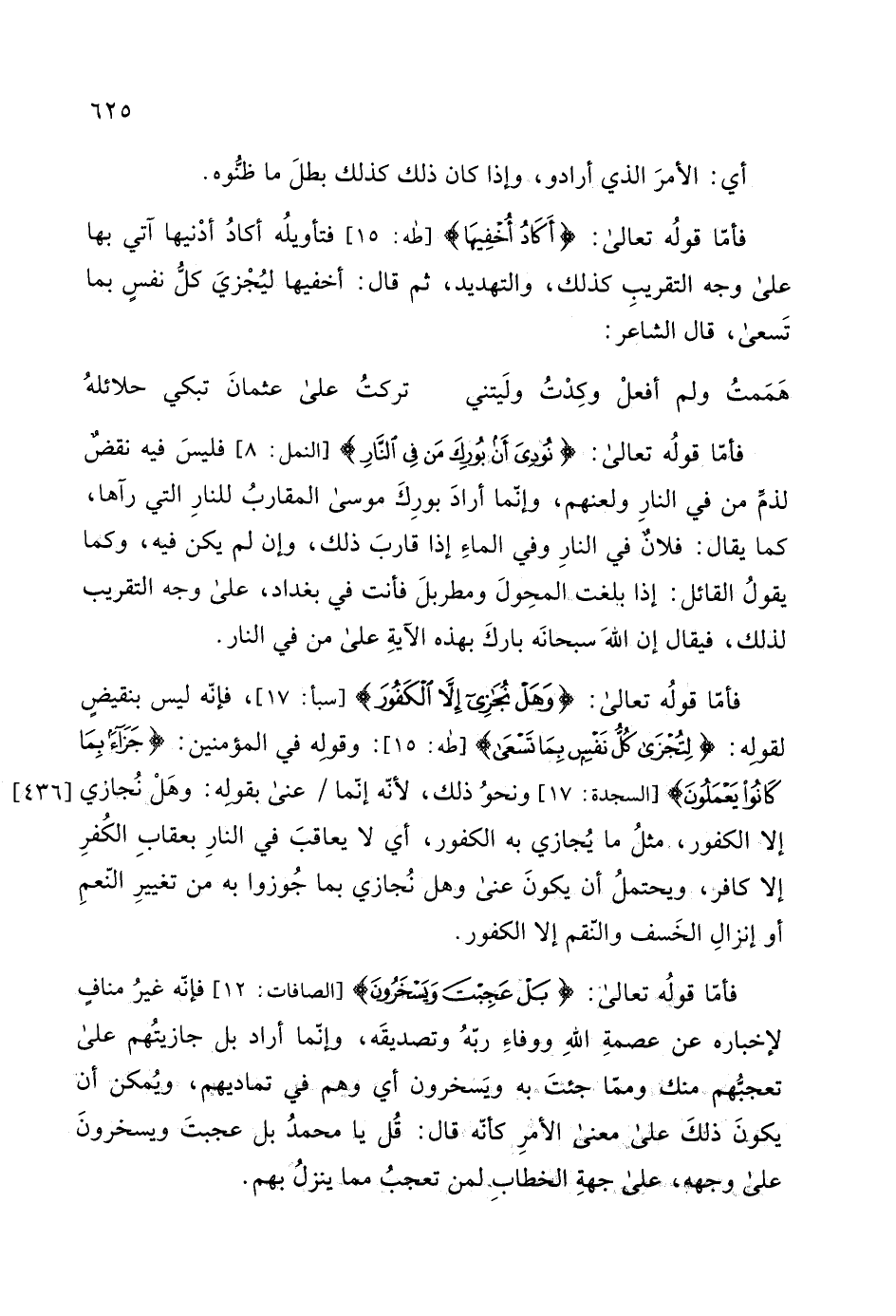 لقوله: (لِتُجْزَى كُلُّ نَفْسٍ بِمَا تَسْعَى) ،: وقوله في المؤمنين: (جَزَاءً بِمَا كَانُوا يَعْمَلُونَ) ، ونحوُ ذلك، لأنّه إنّما عنى بقوله: (وَهَلْ نُجَازِي إِلَّا الْكَفُورَ) ، مثلُ ما يُجازي به الكفور، أي لا يعاقبَ في النارِ بعقابِ الكُفرِ