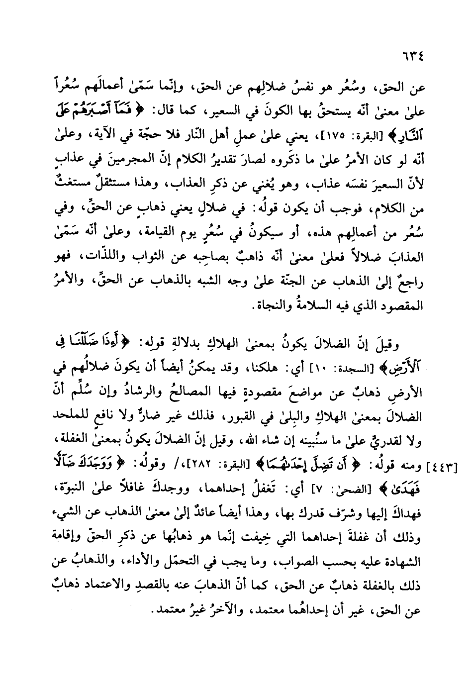 وقيل إن الضلالَ يكونُ بمعنى الغفلة، ومنه قولُه: (أَنْ تَضِلَّ إِحْدَاهُمَا فَتُذَكِّرَ إِحْدَاهُمَا الْأُخْرَى) .