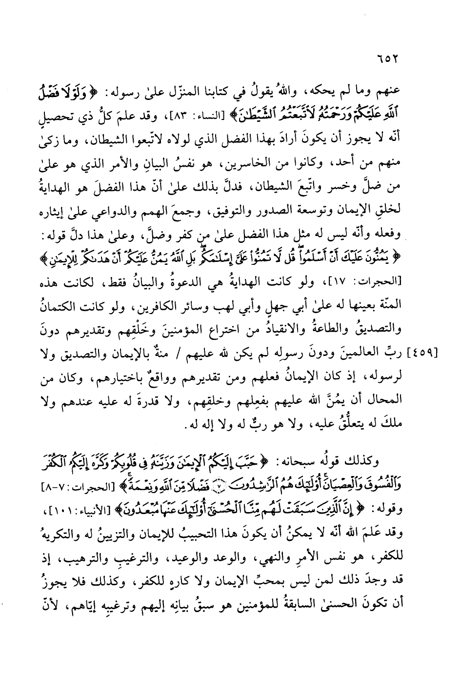 وقد علمَ كلُّ ذي تحصيلٍ أنّه لا يجوز أن يكونَ أرادَ بهذا الفضل الذي لولاه لاتّبعوا الشيطان، وما زكى منهم من أحد، وكانوا من الخاسرين، هو نفسُ البيانِ والأمر الذي هو على من ضلَّ وخسر واتّبعَ الشيطان، فدل بذلك على أنّ هذا الفضلَ هو الهدايةُ لخلقِ الإيمان وتوسعة الصدور والتوفيق، وجمعَ الهمم والدواعي على إيثاره وفعله وأنّه ليس له مثل هذا الفضل على من كفر وضل، وعلى هذا دلَّ قوله: (يَمُنُّونَ عَلَيْكَ أَنْ أَسْلَمُوا قُلْ لَا تَمُنُّوا عَلَيَّ إِسْلَامَكُمْ بَلِ اللَّهُ يَمُنُّ عَلَيْكُمْ أَنْ هَدَاكُمْ لِلْإِيمَانِ إِنْ كُنْتُمْ صَادِقِينَ (17) .