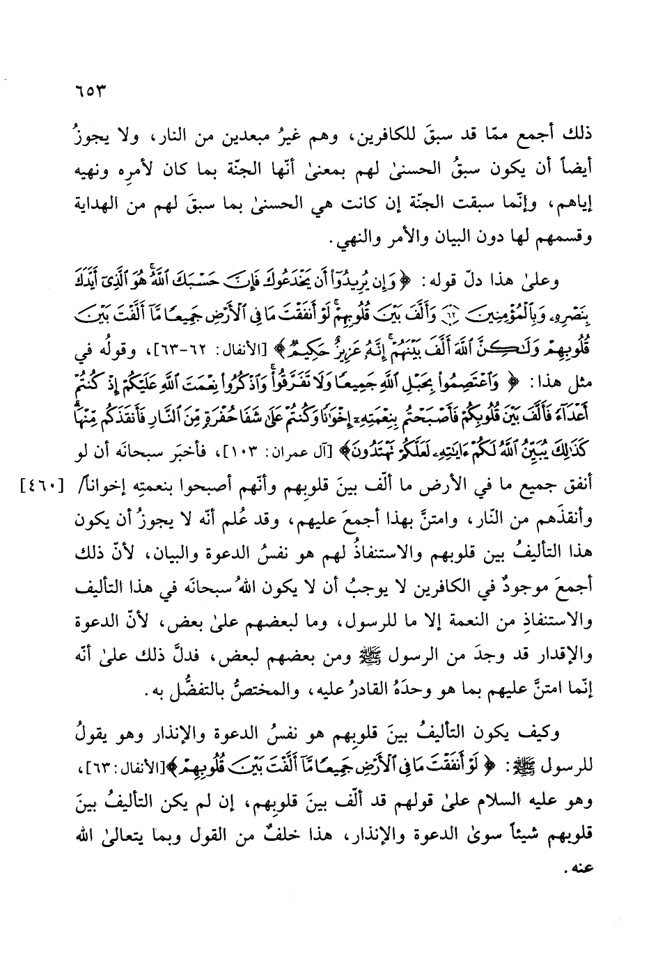 فأخبَر سبحانَه أن لو أنفق جميع ما في الأرض ما ألّف بينَ قلوبِهم وأنّهم أصبحوا بنعمتِه إخوانا، وأنقذَهم من النار، وامتنَّ بهذا أجمعَ عليهم، وقد عُلم أنّه لا يجوزُ أن يكون هذا التأليف ُ بين قلوبهم والاستنقاذُ لهم هو نفسُ الدعوة والبيان، لأن ذلك أجمعَ موجودٌ في الكافرين لا يوجبُ أن لا يكون اللهُ سبحانَه في هذا التأليف والاستنقاذِ من النعمة إلا ما للرسول، وما لبعضهم على بعض، لأن الدعوة والإقدار قد وجدَ من الرسول - صلى الله عليه وسلم - ومن بعضهم لبعض، فدلَّ ذلك على أنه