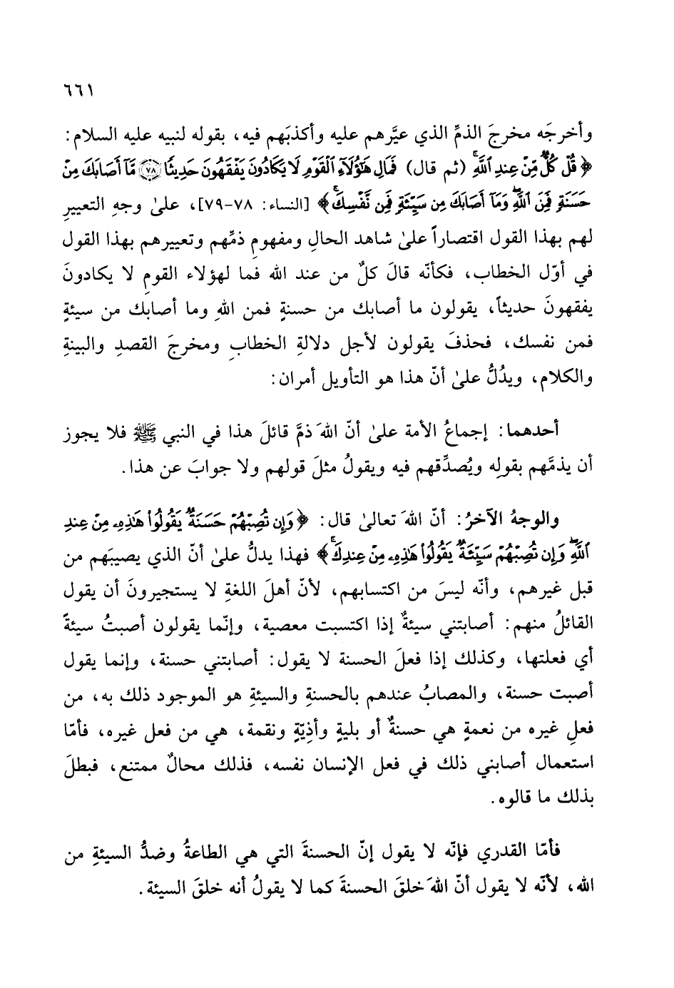 وأخرجَه مخرجَ الذمِّ الذي عيرهم عليه وأكذبَهم فيه، بقوله لنبيه عليه السلام: (قُلْ كُلٌّ مِنْ عِنْدِ اللَّهِ) ثم قال (فَمَالِ هَؤُلَاءِ الْقَوْمِ لَا يَكَادُونَ يَفْقَهُونَ حَدِيثًا (78) مَا أَصَابَكَ مِنْ حَسَنَةٍ فَمِنَ اللَّهِ وَمَا أَصَابَكَ مِنْ سَيِّئَةٍ فَمِنْ نَفْسِكَ) ، على وجهِ التعييرِ لهم بهذا القول اقتصاراً على شاهد الحالِ ومفهومِ ذمهم وتعييرهم بهذا القول في أول الخطاب، فكأنّه قالَ كل من عند الله فما لهؤلاء القومِ لا يكادونَ يفقهونَ حديثاً، يقولون ما أصابك من حسنةٍ فمن اللهِ وما أصابك من سيئةٍ فمن نفسك، فحذفَ يقولون لأجل دلالةِ الخطابِ ومخرجَ القصدِ والبينةِ والكلام، ويدُلُّ على أنّ هذا هو التأويل أمران: