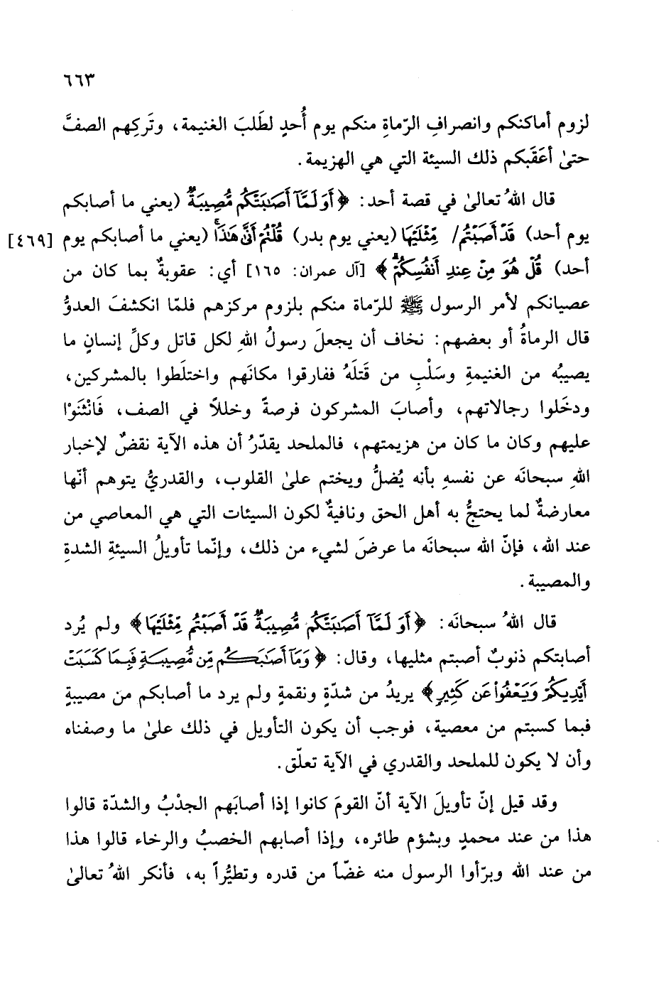 عصيانكم لأمر الرسول - صلى الله عليه وسلم - للرماة منكم بلزوم مركزهم فلمّا انكشفَ العدوُّ قال الرماةُ أو بعضهم: نخاف أن يجعلَ رسولُ اللهِ لكل قاتل وكل إنسانٍ ما يصيبُه من الغنيمةِ وسَلْبِ من قَتلَهُ ففارقوا مكانَهم واختلَطوا بالمشركين، ودخَلوا رجالاتهم، وأصابَ المشركون فرصة وخللاً في الصف، فَانْثنَوْا عليهم وكان ما كان من هزيمتهم، فالملحد يقدرُ أن هذه الآية نقضٌ لإخبار اللهِ سبحانَه عن نفسهِ بأنه يُضل ويختم على القلوب، والقدريُّ يتوهم أنها معارضة لما يحتج به أهل الحق ونافية لكون السيئات التي هي المعاصي من عند الله، فإن الله سبحانَه ما عرضَ لشيء من ذلك، وإنما تأويلُ السيئةِ الشدةِ والمصيبة.
