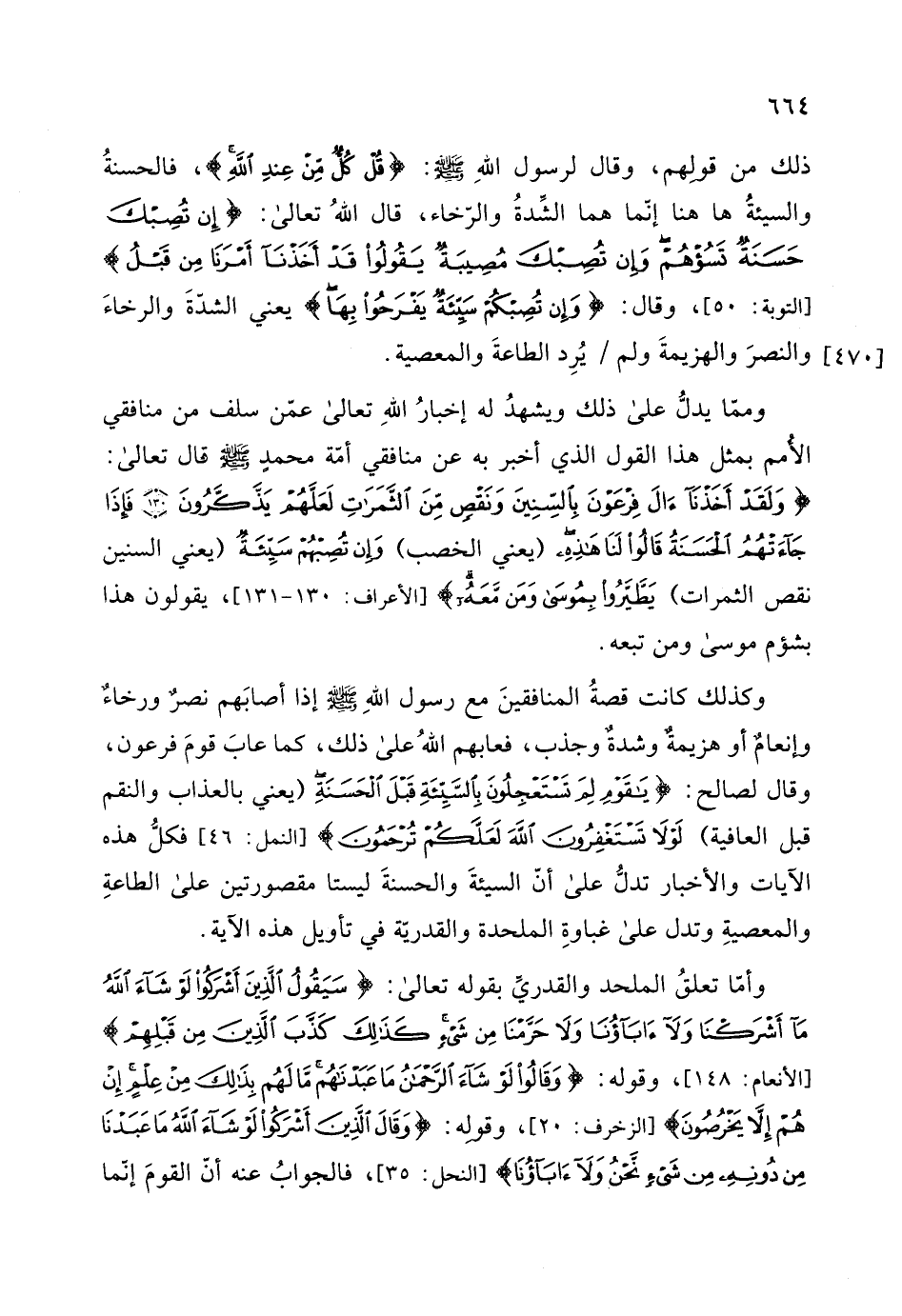 ذلك من قولهم، وقال لرسول اللهِ - صلى الله عليه وسلم -: (قُلْ كُلٌّ مِنْ عِنْدِ اللَّهِ) ، فالحسنةُ والسيئة ها هنا إنما هما الشَدةُ والرخاء، قال الله تعالى: (إِنْ تُصِبْكَ حَسَنَةٌ تَسُؤْهُمْ وَإِنْ تُصِبْكَ مُصِيبَةٌ يَقُولُوا قَدْ أَخَذْنَا أَمْرَنَا مِنْ قَبْلُ) ، وقال: (وَإِنْ تُصِبْكُمْ سَيِّئَةٌ يَفْرَحُوا بِهَا) يعني الشدةَ والرخاءَ