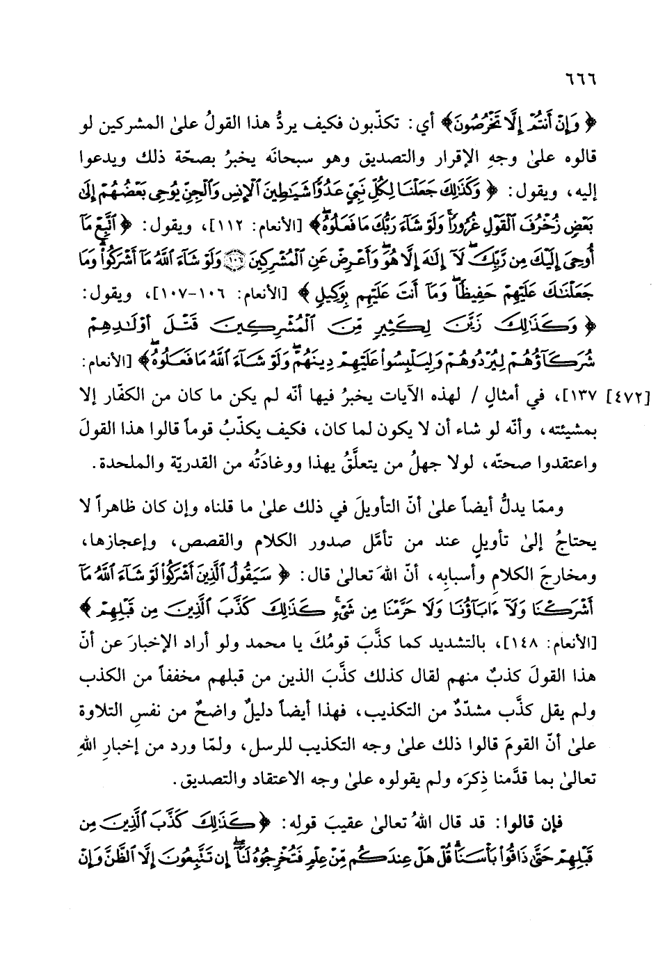 ويقول: (وَكَذَلِكَ زَيَّنَ لِكَثِيرٍ مِنَ الْمُشْرِكِينَ قَتْلَ أَوْلَادِهِمْ شُرَكَاؤُهُمْ لِيُرْدُوهُمْ وَلِيَلْبِسُوا عَلَيْهِمْ دِينَهُمْ وَلَوْ شَاءَ اللَّهُ مَا فَعَلُوهُ) ، في أمثالٍ لهذه الآيات يخبرُ فيها أنه لم يكن ما كان من الكفار إلا بمشيئته، وأنَّه لو شاء أن لا يكون لما كان، فكيف يكذبُ قوما قالوا هذا القولَ واعتقدوا صحته، لولا جهلُ من يتعلقُ بهذا ووغادَتُه من القدرية والملحدة.