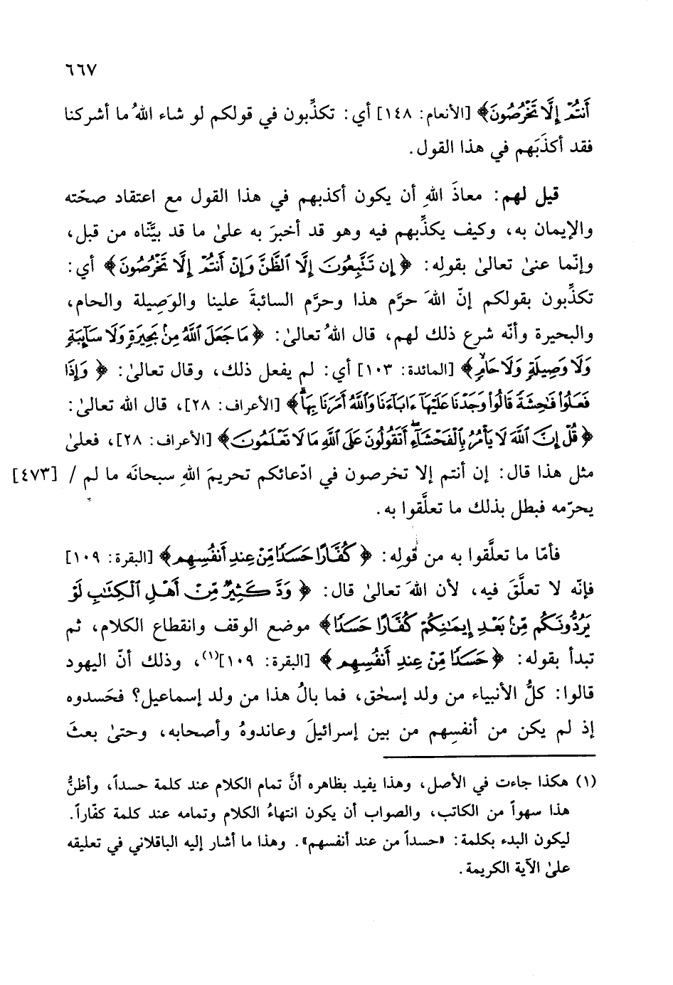 فأمَّا ما تعلَّقوا به من قوله: (كُفَّارًا حَسَدًا مِنْ عِنْدِ أَنْفُسِهِمْ) ، فإنه لا تعلٌّقَ فيه، لأن اللهَ تعالى قال: (وَدَّ كَثِيرٌ مِنْ أَهْلِ الْكِتَابِ لَوْ يَرُدُّونَكُمْ مِنْ بَعْدِ إِيمَانِكُمْ كُفَّارًا) موضع الوقف وانقطاع الكلام، ثم تبدأ بقوله: (حَسَدًا مِنْ عِنْدِ أَنْفُسِهِمْ) ، وذلك أنّ اليهود قالوا: كل الأنبياء من ولد إسحق، فما بالُ هذا من ولد إسماعيل، فحَسدوه إذ لم يكن من أنفسِهم من بين إسرائيلَ وعاندوهُ وأصحابه، وحتى بعثَ