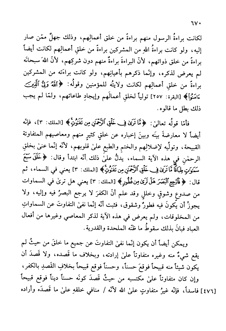 براءةً من خلق ذواتهم، لأنّ البراءةَ براءبلا منهم دون شركِهم، لأن اللهَ سبحانَه لم يعرض لذكره، وإنَّما ذكرهم بأعيانِهم، ولو كانت براءَته من المشركين براءةً من خلقِ أعمالِهم لكانت ولايتُه للمؤمنين وقولُه: (اللَّهُ وَلِيُّ الَّذِينَ آمَنُوا) ، توليا لخلقِ أعمالَهم وإيجادِ طاعاتهم، ولما لم يجب