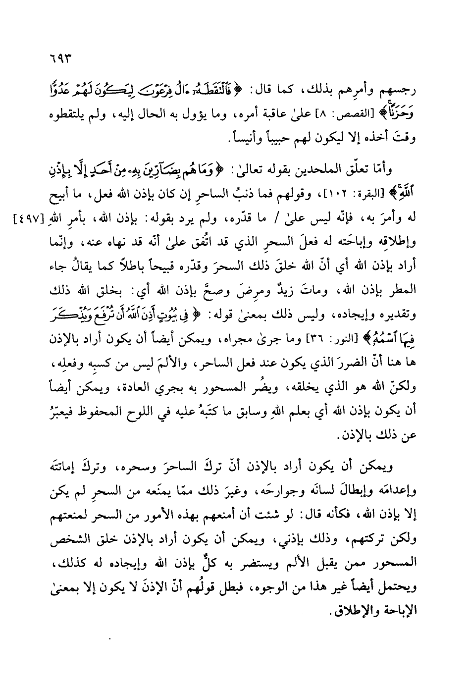 وأمَّا تعلق الملحدين بقوله تعالى: (وَمَا هُمْ بِضَارِّينَ بِهِ مِنْ أَحَدٍ إِلَّا بِإِذْنِ اللَّهِ) ، وقولهم فما ذنبُ الساحرِ إن كان بإذن الله فعل، ما أبيح له وأمرَ به، فإنّه ليس على ما قدره، ولم يرد بقوله: بإذن الله، بأمرِ اللهِ وإطلاقِه وإباحَته له فعلَ السحرِ الذي قد اتُفق على أنه قد نهاه عنه، وإنما أراد بإذن الله أي أنّ الله خلقَ ذلك السحرَ وقدره قبيحا باطلا كما يقالُ جاء