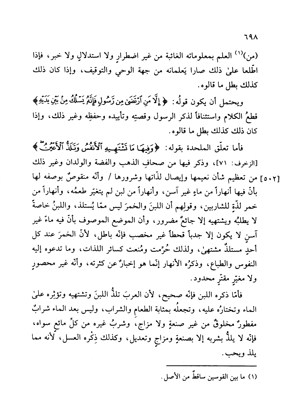 أحدٍ مستلذ مشتهى، ولذلك حُرِّمت ومُنعت كسائر اللذات، وما تدعوه إليه النفوس والطباع، وذكرُه الأنهار إنّما هو إخبار عن كثرته، وأنَّه غير محصورٍ ولا مغيّرٍ مقترٍ محدود.