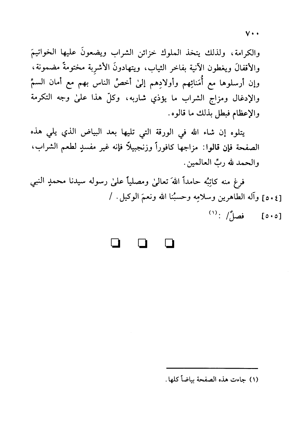 الصفحة فإن قالوا: مزاجها كافوراً وزنجبيلاً فإنه غير مفسدٍ لطعم الشراب.