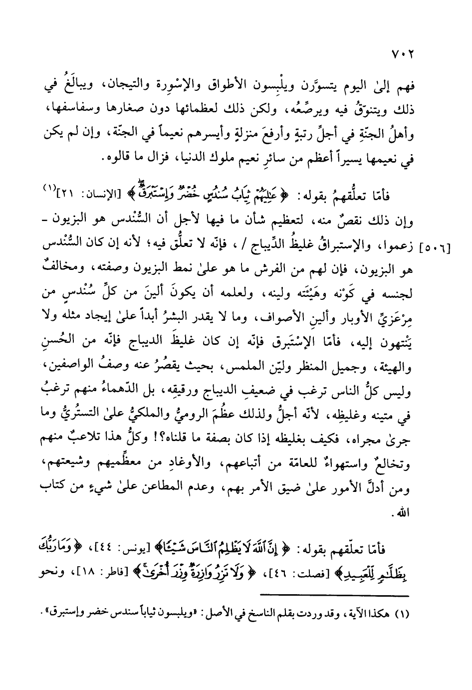 فأمَّا تعلُّقهم ُ بقوله: (عَالِيَهُمْ ثِيَابُ سُنْدُسٍ خُضْرٌ وَإِسْتَبْرَقٌ) .