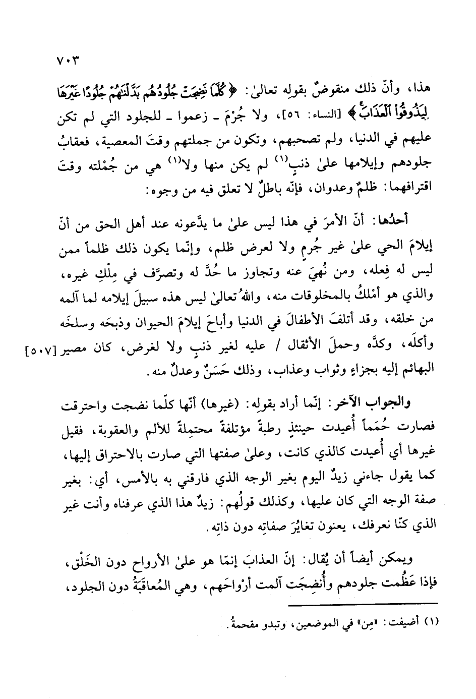 ونحو هذا، وأن ذلك منقوضٌ بقوله تعالى: (كُلَّمَا نَضِجَتْ جُلُودُهُمْ بَدَّلْنَاهُمْ جُلُودًا غَيْرَهَا لِيَذُوقُوا الْعَذَابَ) ، ولا جُرْمَ - زعموا - للجلود التي لم تكن