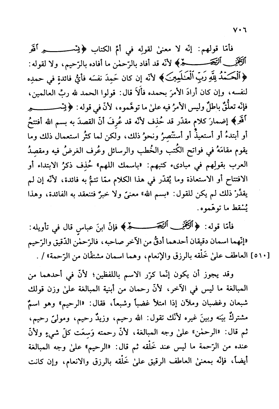 لأنه قد أفاد بالرحمن ما أفاده بالرحيم، ولا لقوله: (الْحَمْدُ لِلَّهِ رَبِّ الْعَالَمِينَ) لأنه إن كان حَمِدَ نفسَه فأيُّ فائدةٍ في حمدِه لنفسه، وإن كان أرادَ الأمرَ بحمده فألاَ قال: قولوا (الْحَمْدُ لِلَّهِ رَبِّ الْعَالَمِينَ) ، فإنه تعلُّقٌ باطلٌ وليس الأمرُ فيه على ما توهموه، لأن في قوله: (بِسْمِ اللَّهِ) إضمارَ كلام مقدر قد حُذِف لأنه قد عُرِفَ أن القصدَ به بسم الله أفتتحُ أو أبتدءُ أو أستعيذ أو أستنْصِرُ ونحوُ ذلك، ولكن لما كثُر استعمال ذلك وما يقوم مقامَهُ في فواتح الكُتب والخطب والرسائل وعُرف الغرضُ فيه ومقصِدُ