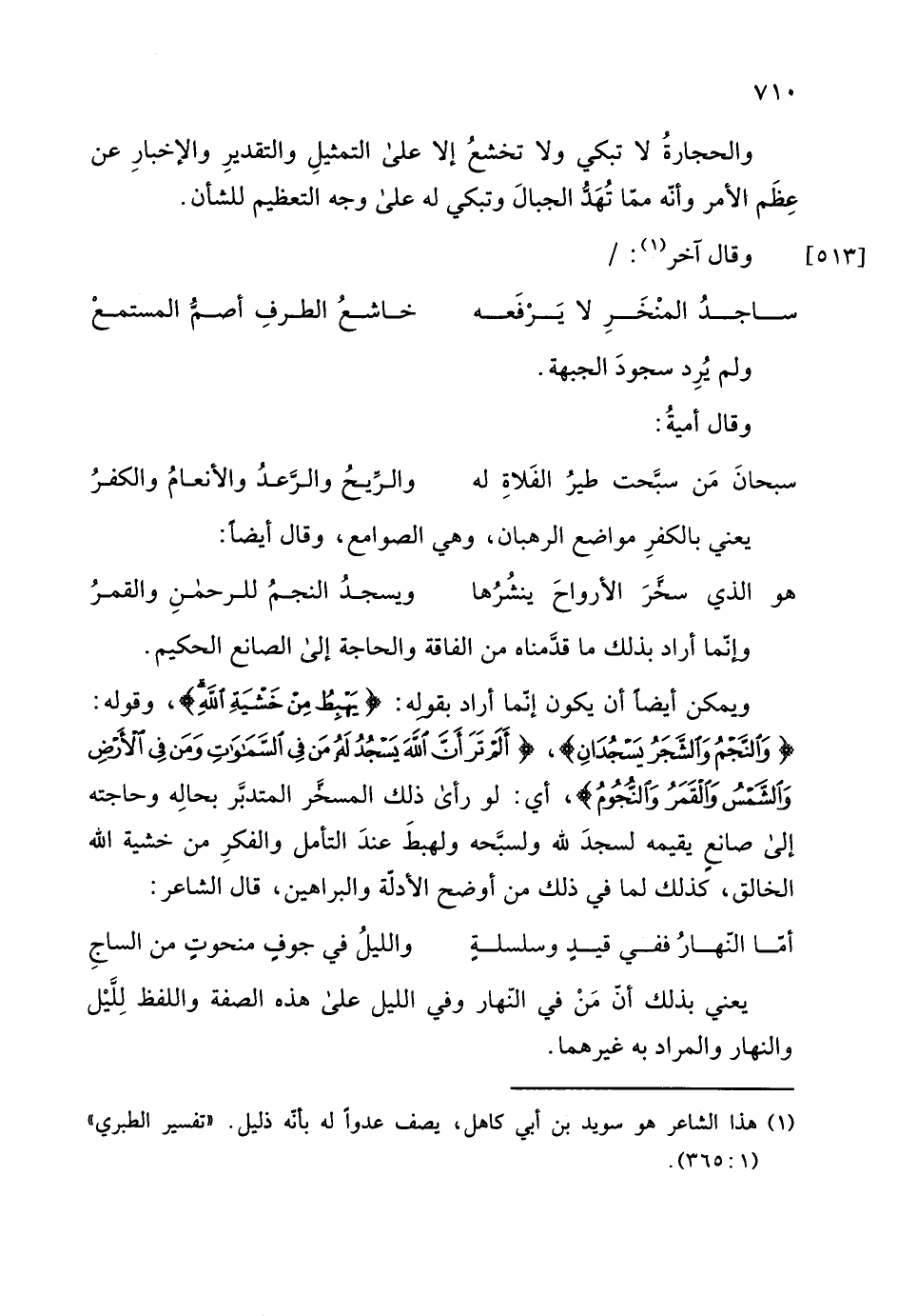وقوله: (وَالنَّجْمُ وَالشَّجَرُ يَسْجُدَانِ) ، (أَلَمْ تَرَ أَنَّ اللَّهَ يَسْجُدُ لَهُ مَنْ فِي السَّمَاوَاتِ وَمَنْ فِي الْأَرْضِ وَالشَّمْسُ وَالْقَمَرُ وَالنُّجُومُ) ، أي: لو رأى ذلك المسخَّر المتدبَّر بحالِه وحاجته إلى صانعٍ يقيمه لسجدَ لله ولسبَّحه ولهبطَ عندَ التأمل والفكرِ من خشية الله الخالق، كذلك لما في ذلك من أوضح الأدلة والبراهين، قال الشاعر: