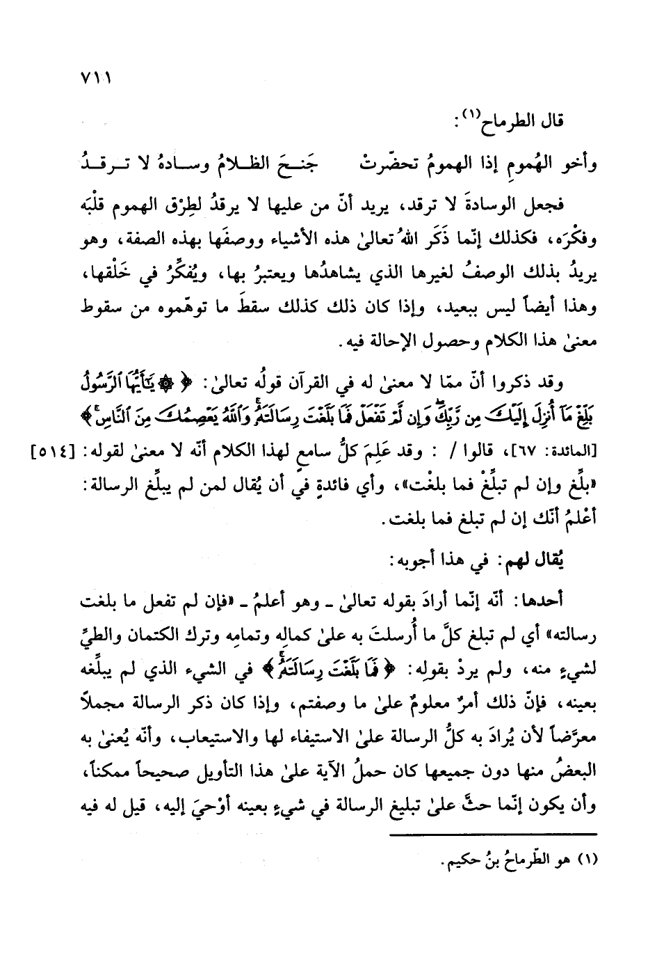 وقد ذكروا أن مما لا معنى له في القرآن قولُه تعالى: (يَا أَيُّهَا الرَّسُولُ بَلِّغْ مَا أُنْزِلَ إِلَيْكَ مِنْ رَبِّكَ وَإِنْ لَمْ تَفْعَلْ فَمَا بَلَّغْتَ رِسَالَتَهُ وَاللَّهُ يَعْصِمُكَ مِنَ النَّاسِ) ، قالوا: وقد عَلِمَ كل سامعِ لهذا الكلام أنه لا معنى لقوله: بَلِّغْ (وَإِنْ لَمْ تَفْعَلْ فَمَا بَلَّغْتَ) ، وأي فائدةِ في أن يُقال لمن لم يبلغ الرسالة: