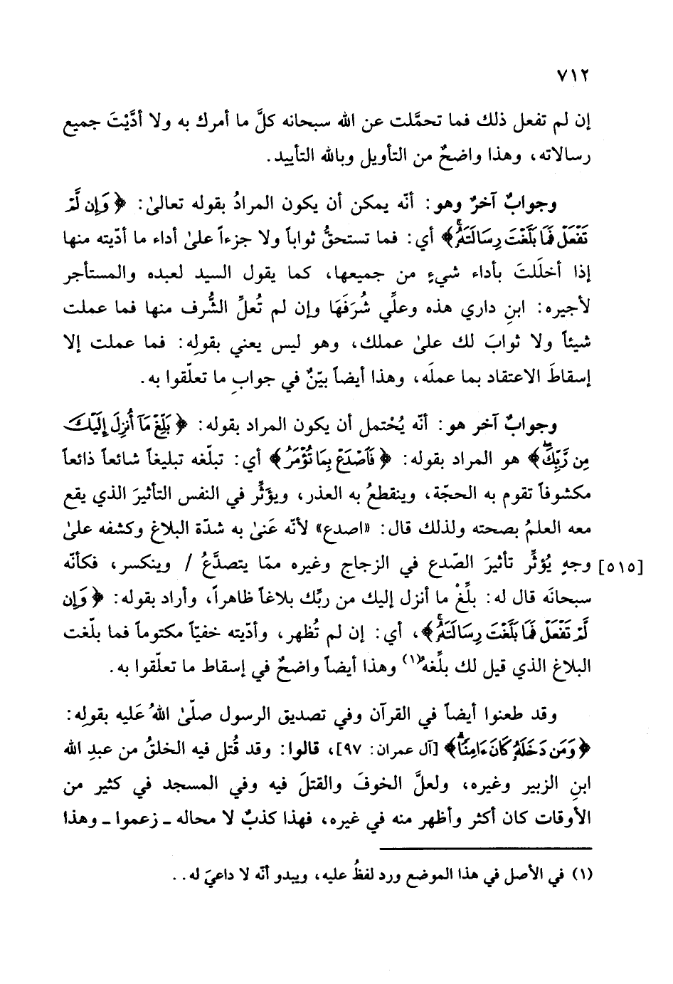 سبحانَه قال له: (بَلِّغْ مَا أُنْزِلَ إِلَيْكَ مِنْ رَبِّكَ) بلاغا ظاهراً، وأراد بقوله: (وَإِنْ لَمْ تَفْعَلْ فَمَا بَلَّغْتَ رِسَالَتَهُ) ، أي: إن لم تُظهر، وأديته خفيًّا مكتوماً فما بلغت البلاغ الذي قيل لك بلًغه وهذا أيضا واضح في إسقاط ما تعلقوا به.