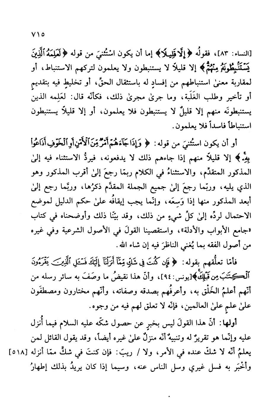 فقولُه (إِلَّا قَلِيلًا) إما أن يكون اسْتُثنيَ من قوله (لَعَلِمَهُ الَّذِينَ يَسْتَنْبِطُونَهُ مِنْهُمْ) إلا قليلاً لا يستنبطون ولا يعلمون لتركهم الاستنباط، أو لمقاربة معنى استنباطهم من إفسادٍ له باستثقال الحق، أو تخليطٍ فيه بتقديمٍ